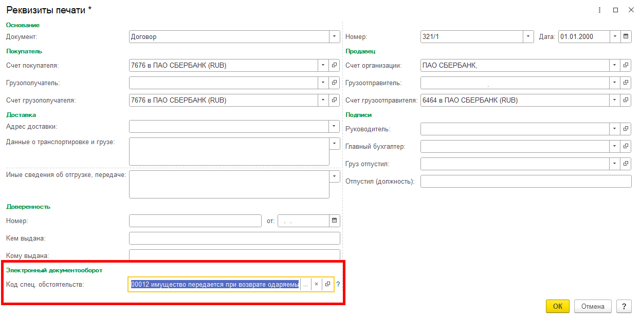 В обязательном к применению с 01.04.2025 формате версии 5.02 электронного УПД предусмотрено указание кода специальных обстоятельств. На текущий момент перечень кодов содержит 112 значений, которые добавлены в состав конфигурации в регистре сведений Перечень специальных обстоятельств документа ЭДО. Код специальных обстоятельств указывается в реквизите Код спец. обстоятельств в форме, которая открывается по ссылке Реквизиты печати / Акта на передачу прав на закладке Дополнительно документа, которым отражается операция (например, Реализация товаров и услуг, Возврат товаров поставщику, Акт выполненных работ, Корректировка реализации, Передача товаров между организациями, Возврат товаров между организациями, Передача на комиссию, Реализация услуг и прочих активов, и т.д.).