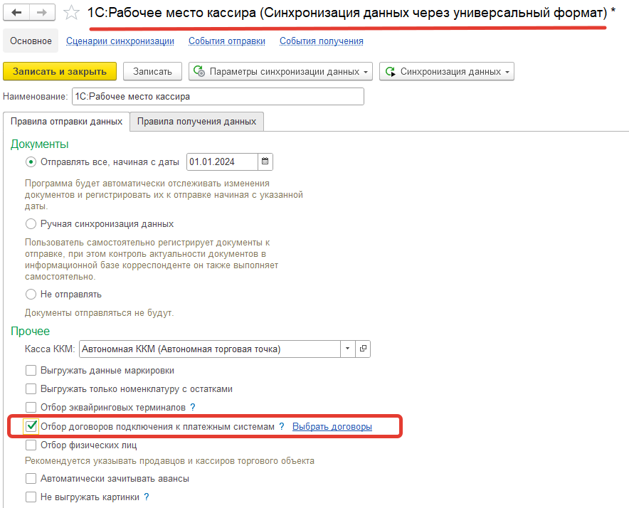 В помощнике настройки обмена с 1С:РМК устанавливается флаг Отбор договоров подключения к платежным системам, и далее по ссылке Выбрать договоры необходимо указать настроенный договоры подключения к СБП, с которыми предполагается работа на стороне 1С:РМК в торговой точке. Данные выгружаются в 1С:РМК вручную или автоматически по расписанию.