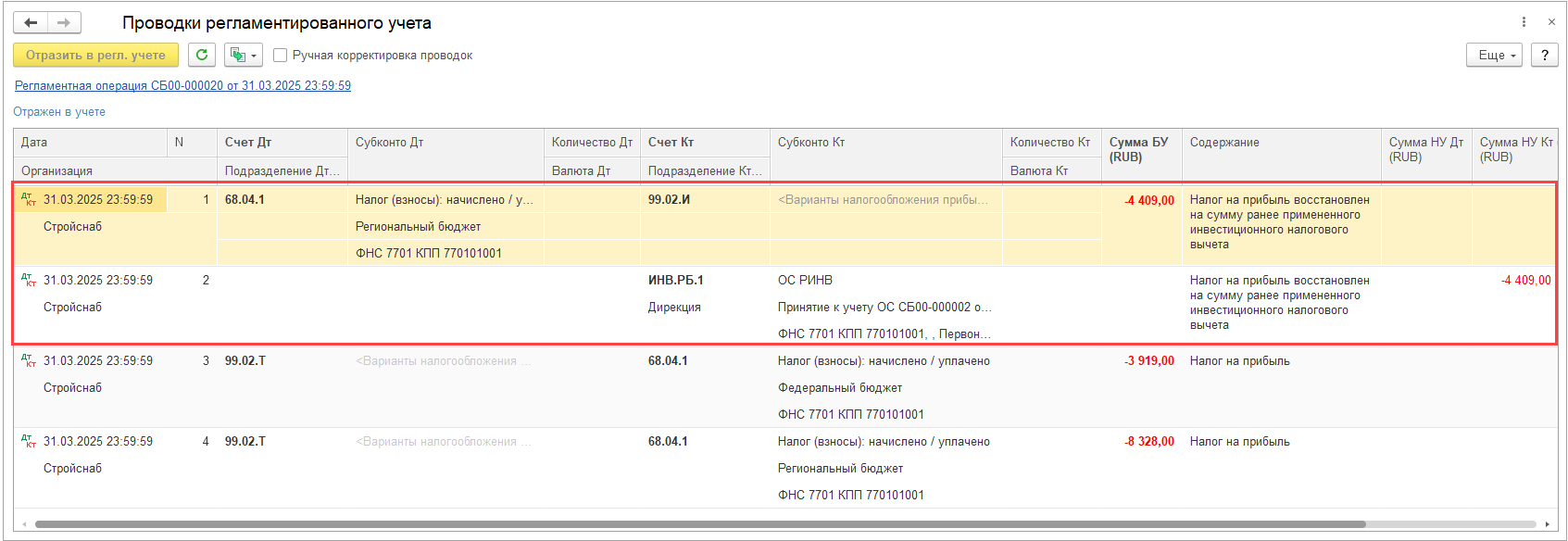 Расчет пени и восстановление вычета автоматически не производится. В документе выбытия ОС/НМА выводится сообщение о том, что по объекту был применении инвестиционный налоговый вычет и пользователю необходимо восстановить налог. Проводки по восстановлению налога пользователю необходимо отразить документом Операция (регл. учет).