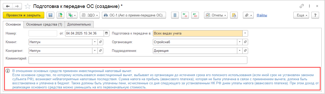 При выбытии (в т.ч. частичном) объекта ОС/НМА, по которому был применен инвестиционный налоговый вычет, ранее 5 лет, если применен ФИНВ, или ранее количества лет, указанных в настройке Минимальный срок фактического использования учетной политики, если применен РИНВ, и до истечения срока полезного использования объекта, необходимо: