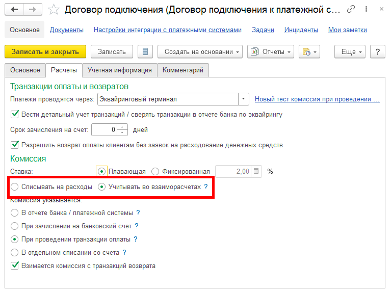 При выбранном значении Учитывать во взаиморасчетах на закладке Учетная информация карточки договора подключения к платежной системе указывается Объект расчетов комиссии – элемент справочника Договоры с контрагентами с видом договора с поставщиком. По указанному договору будет отражаться взаиморасчеты с банком по комиссии в документе, в которым отражается сумма комиссии (определяется соответствующей настройкой в договоре подключения).