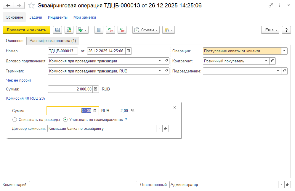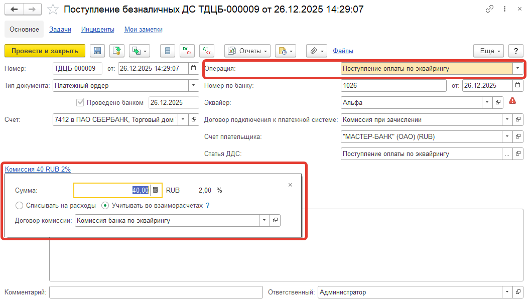 В зависимости от настроек в форме договора подключения к платежной системе на закладке Расчеты комиссия отражается: