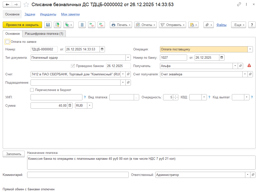 Обязательства банка закрываются документом Приобретение товаров и услуг или Приобретение услуг и прочих активов. В документе выделяется НДС. Сумма комиссии без НДС списывается на указанную в документе статью расходов. НДС относится на счет 19.04 и далее принимается к вычету по общему правилу.