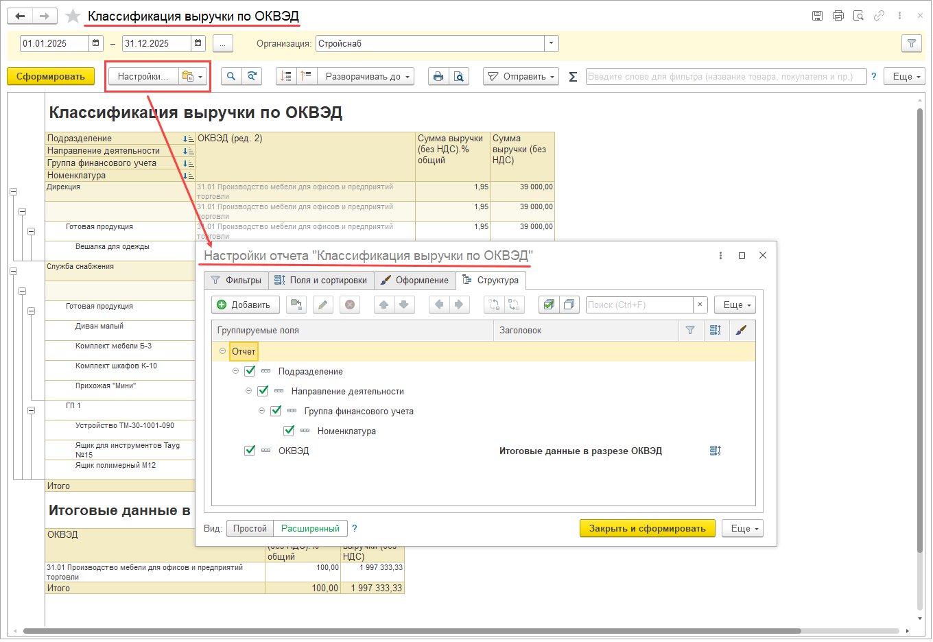 В группировке отчета на одном уровне должно быть добавлено только одно поле. Иначе отчет сформируется с данными по выручке, но без данных по ОКВЭД, т.к. нет понимания приоритета полей