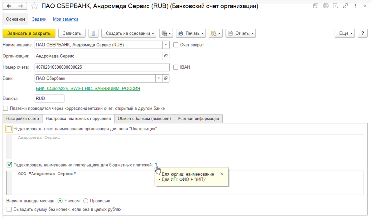В карточке справочника Банковские счета организаций переименована закладка Печать платежных поручений в Настройка платежных поручений. На данной закладке добавлено поле Редактировать наименование плательщика для бюджетных платежей для ввода наименования организации с учетом новых правил. Подсказка для данного поля выводит краткое описание: