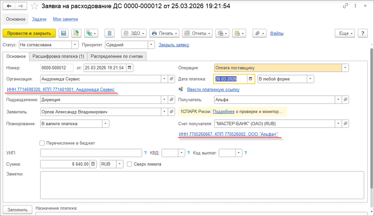 Особенности заполнения реквизитов плательщика в документах Заявка на расходование ДС и Списание безналичных: