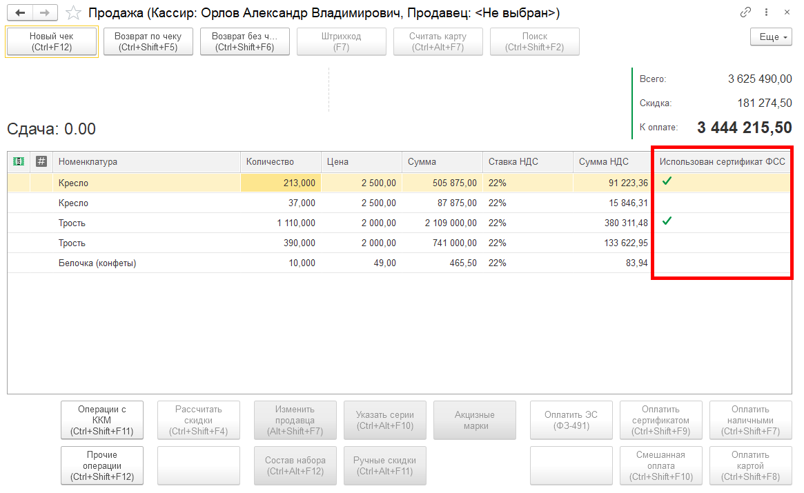 После пробития чека, если была оплата сертификатами ФСС в таблице Товары, отображается колонка использования сертификатов ФСС