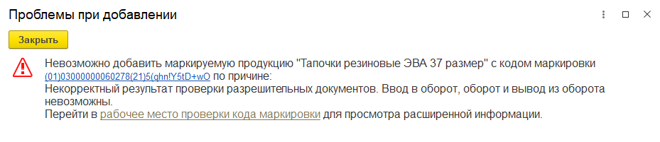 Указание кодов не прошедших контроль РД при отгрузке или приемке маркируемой продукции после наступления даты обязательно проверки РД не допускается. При попытке добавления кода маркировки в форме Подбор и проверка… будет выведено предупреждение о некорректном результате проверки РД, если наступила дата контроля РД по товарной группе