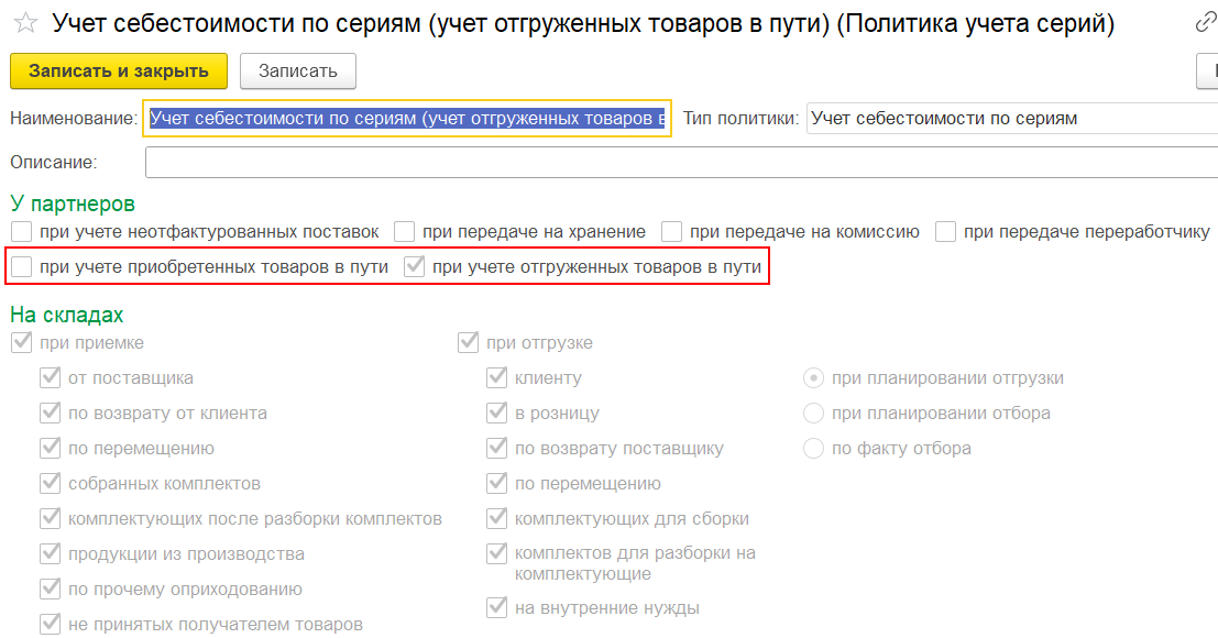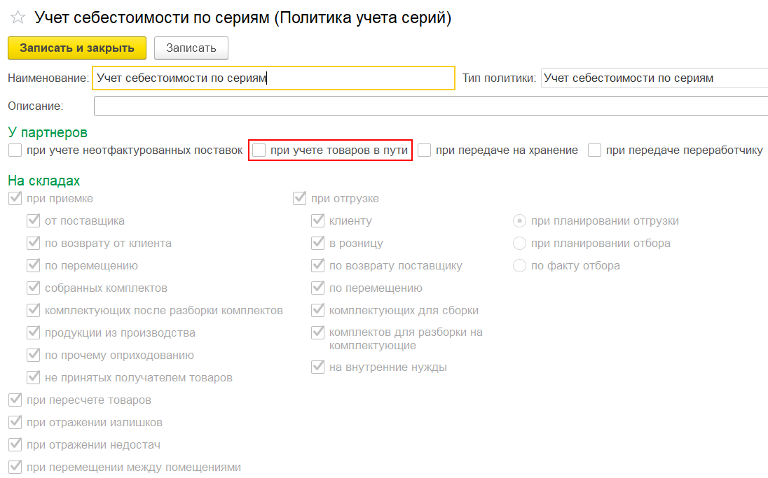 При работе с отгруженными товарами в пути с целью идентификации партии товаров предусмотрен тип политики учета серий Учет себестоимости по сериям.