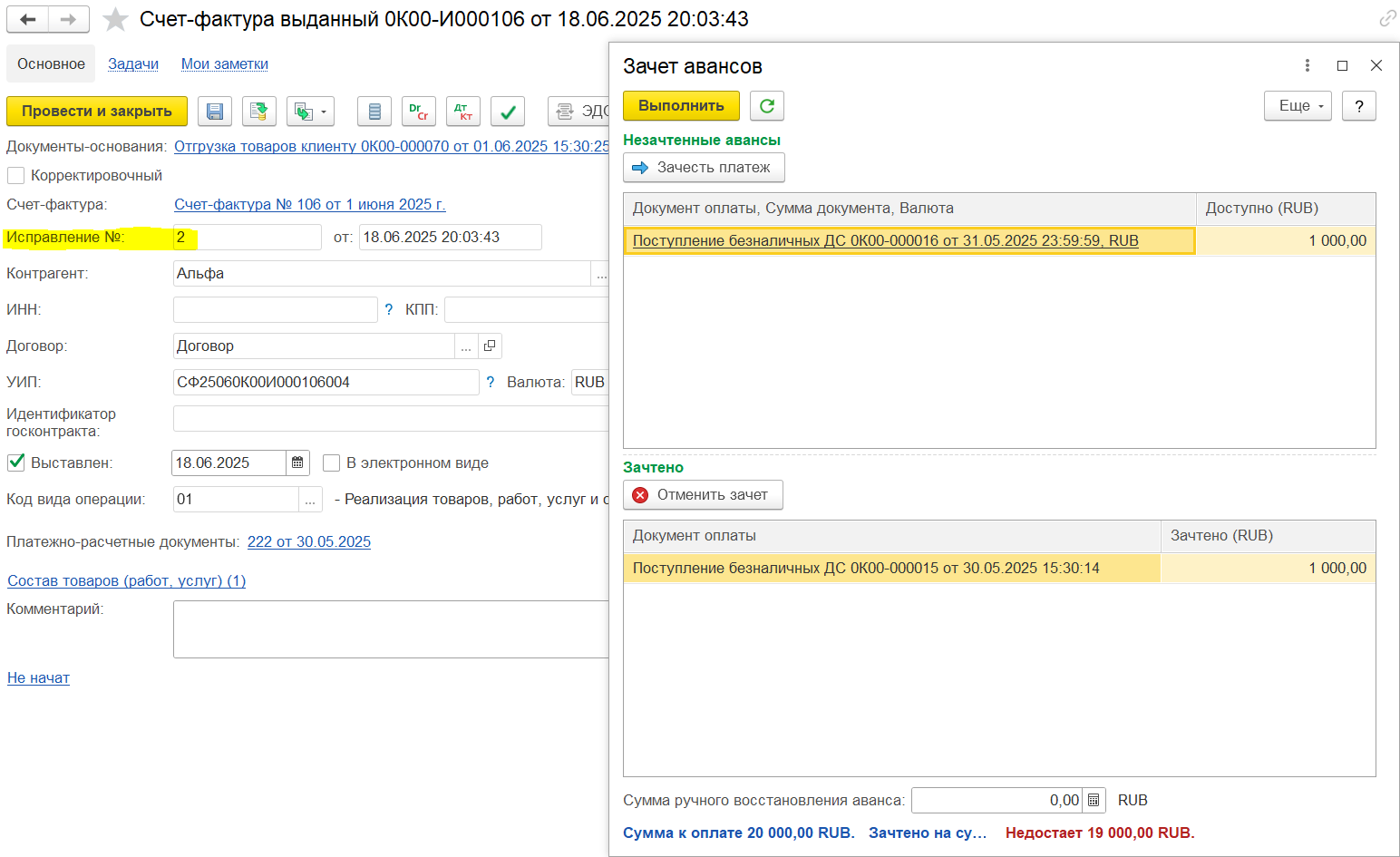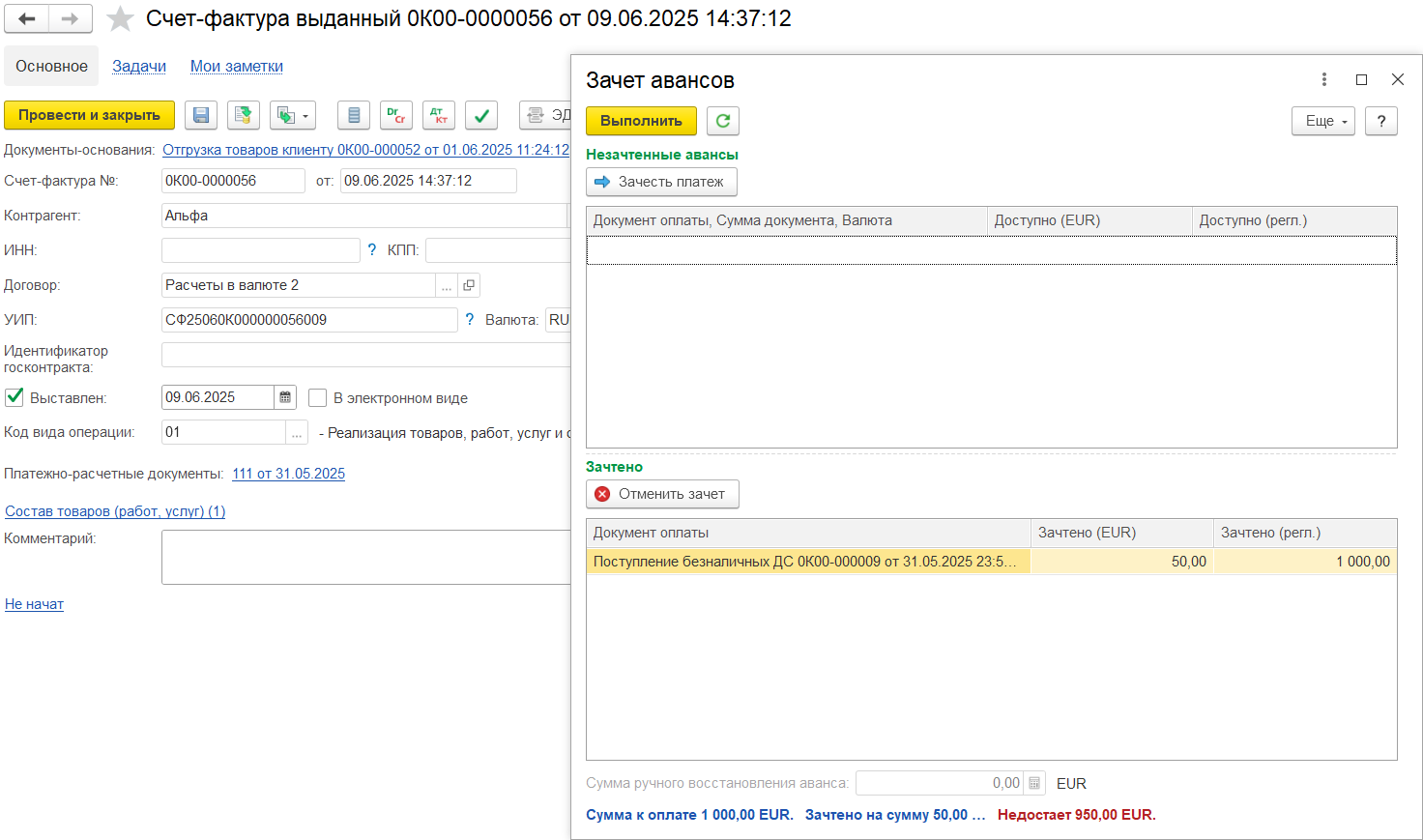 Например, аванс 450 000, зачтено в счете-фактуре 100 000, доступно для зачета в следующих счетах-фактурах будет 350 000. Если аванс уже был зачтен в счете-фактуре, то этот аванс не отображается для зачета.