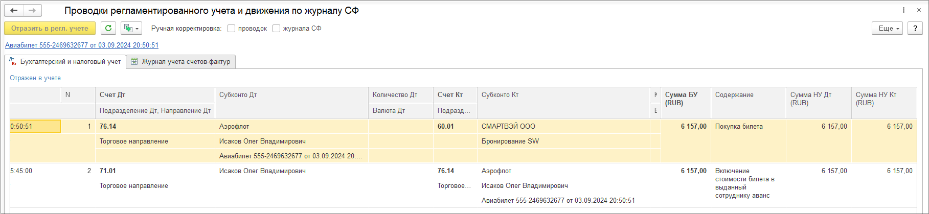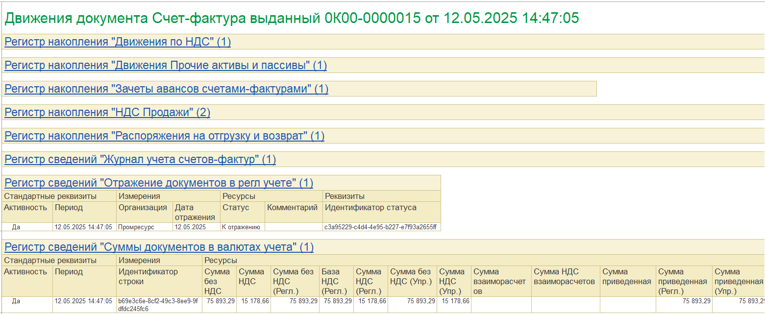 ИСФ при проведении формирует движения по сумме НДС: Сторно «неправильных» движений в «Книге продаж», «правильные» движения в «Книге продаж».