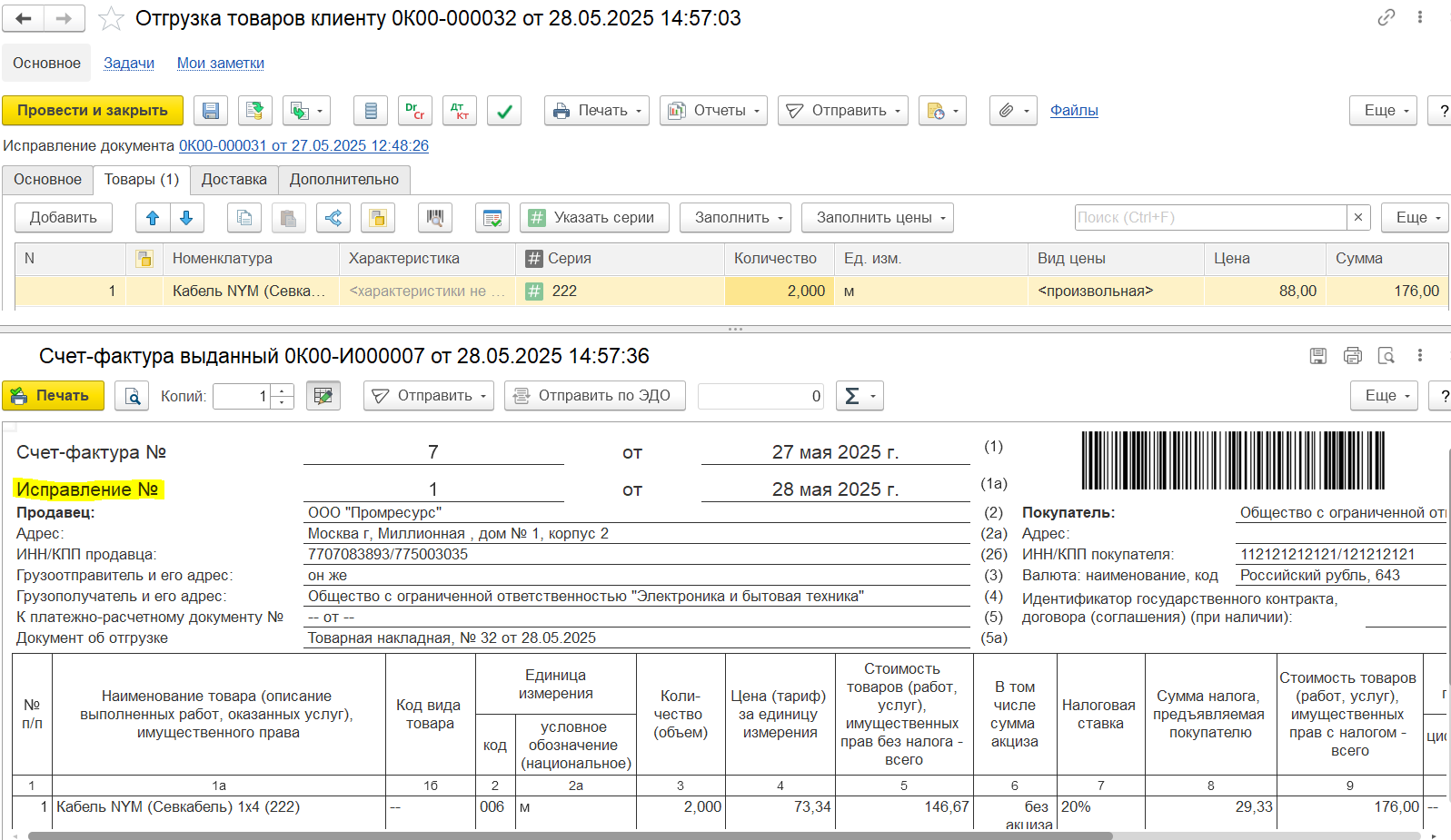 В разделе К отражению в счетах-фактурах формируются данные, которые нужно отразить в корректировочных счетах-фактурах, например, это данные по результату оформления документа списания недостачи отгруженного товара на 1 шт. суммой 35 000 руб. и поступления товара от клиента на 1 шт. суммой 30 000 руб.