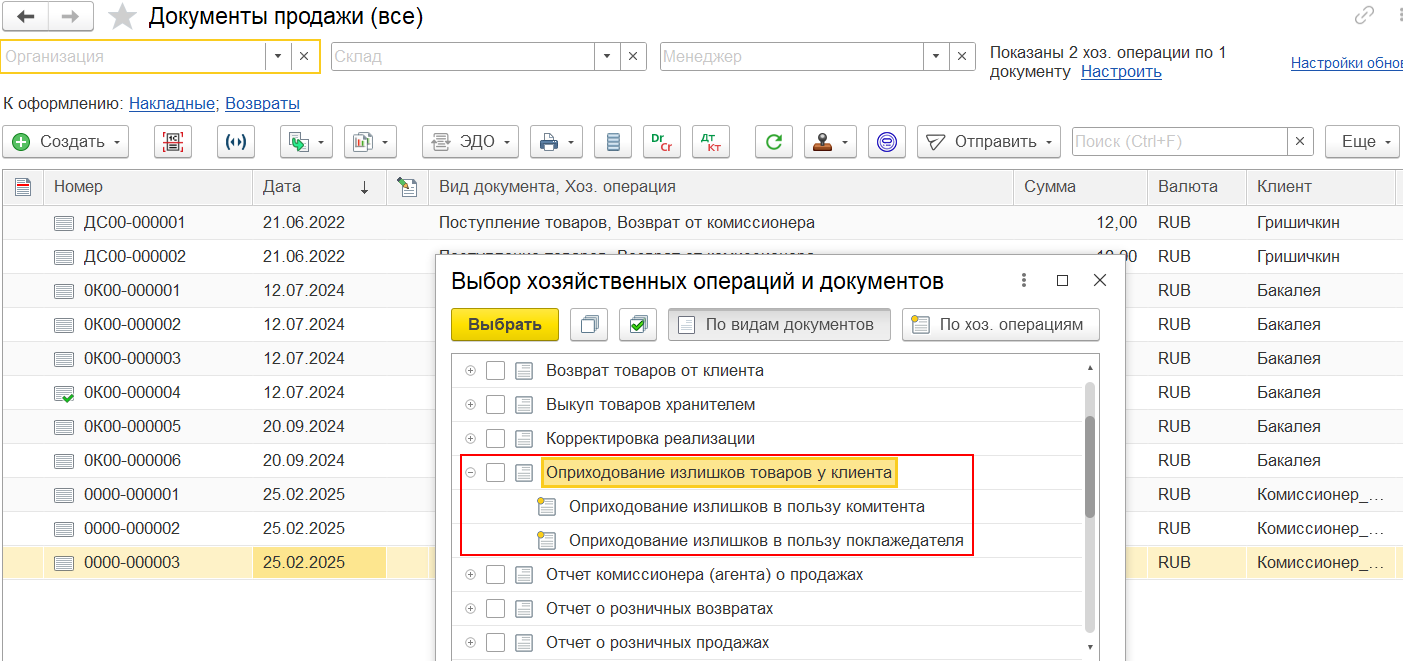На основании одного заказа клиента с операцией Реализация могут быть введены разные виды документов: