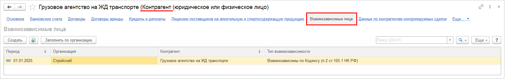 Есть коды операций по реализации со ставкой НДС 0%, зависящие от отношений взаимозависимости контрагента и организации. Если контрагент взаимозависим от организации, то необходимо в списке Взаимозависимые лица создать запись с определением типа взаимозависимости. Для удобства заполнения информации о взаимозависимости в карточку элемента списка Контрагенты добавлена гиперссылка Взаимозависимые лица. Гиперссылка доступна, если в информационной базе включена функциональная опция Контролируемые сделки (меню НСИ и администрирование – Настройка НСИ и разделов – Регламентированный учет - Отчетность).