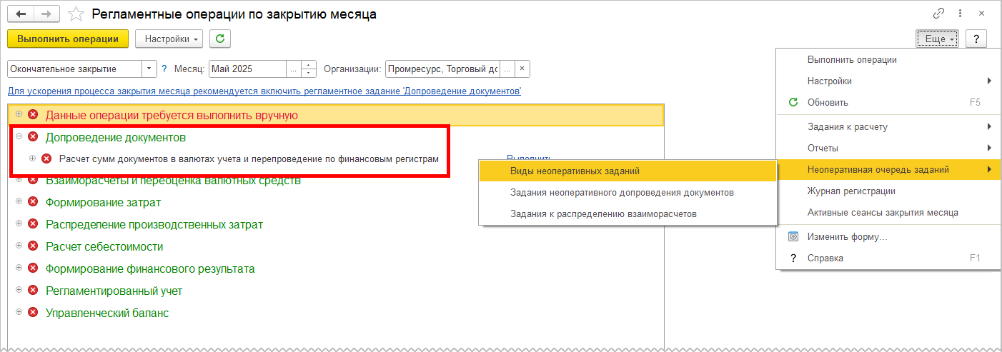 Администратору информационной базы доступен справочник Виды неоперативных заданий, а также сформированные задания в меню Еще – Неоперативная очередь зданий формы Регламентные операции по закрытию месяца.