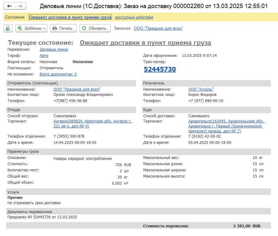 В списке Деловые линии (1С:Доставка): Заказы на доставку добавлена колонка Документы перевозчика. В итоговую информацию о заказе также добавлена секция с информацией о документах перевозчика.