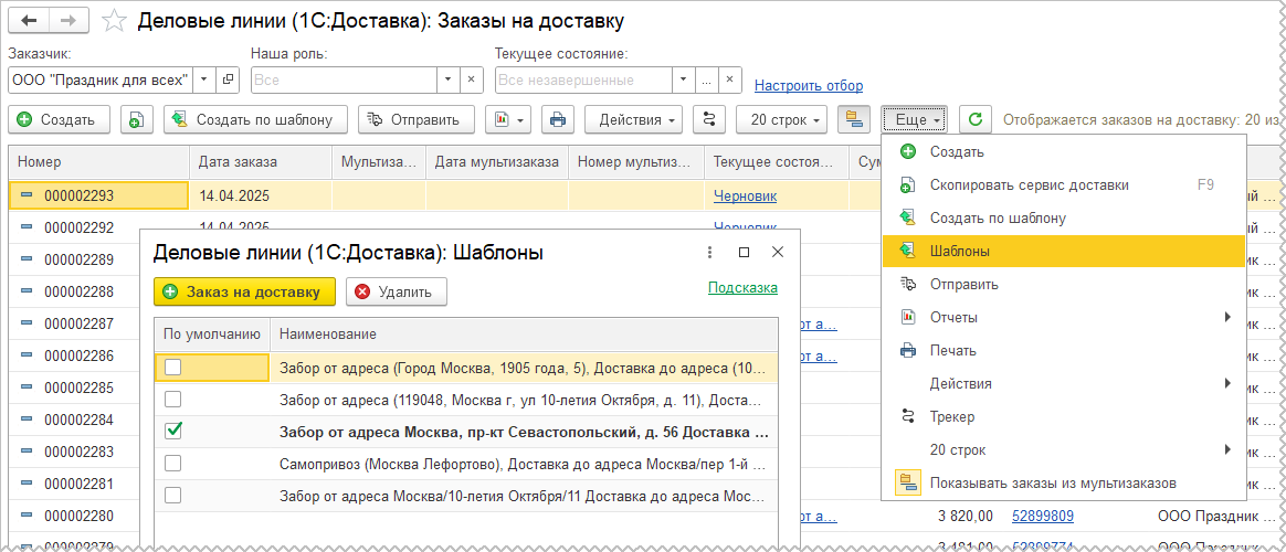 Команда Создать по шаблону в списке Деловые линии (1С:Доставка): Заказы на доставку позволяет создать новый заказ с использованием выбранного шаблона. Также можно заполнить по шаблону уже созданный заказ на доставку командой Шаблоны – Заполнить по… в форме заказа