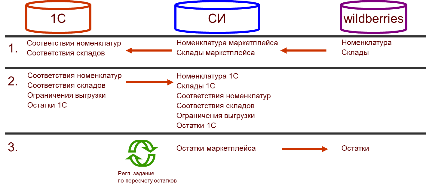 Сервис интеграции (СИ) – посредник, производит пересчет остатков 1С в остатки торговой площадки, с учетом ограничений и иерархии складов 1С. Выгружает результат в Wildberries. Сервис реализован на технологии 1С: Элемент.