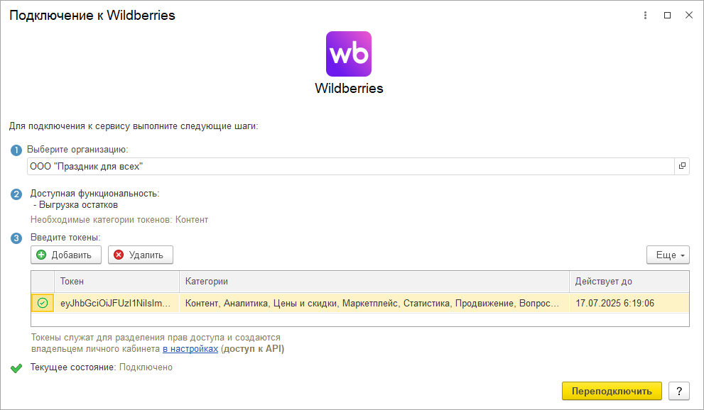 Если подключение к сервису интеграции настроено, то открывается форма Учетные записи Wildberries, в которой можно создать новое подключение. Для этого нужно указать организацию информационной базы, по которой настраивается подключение, и токен, полученный на сайте Wildberries.