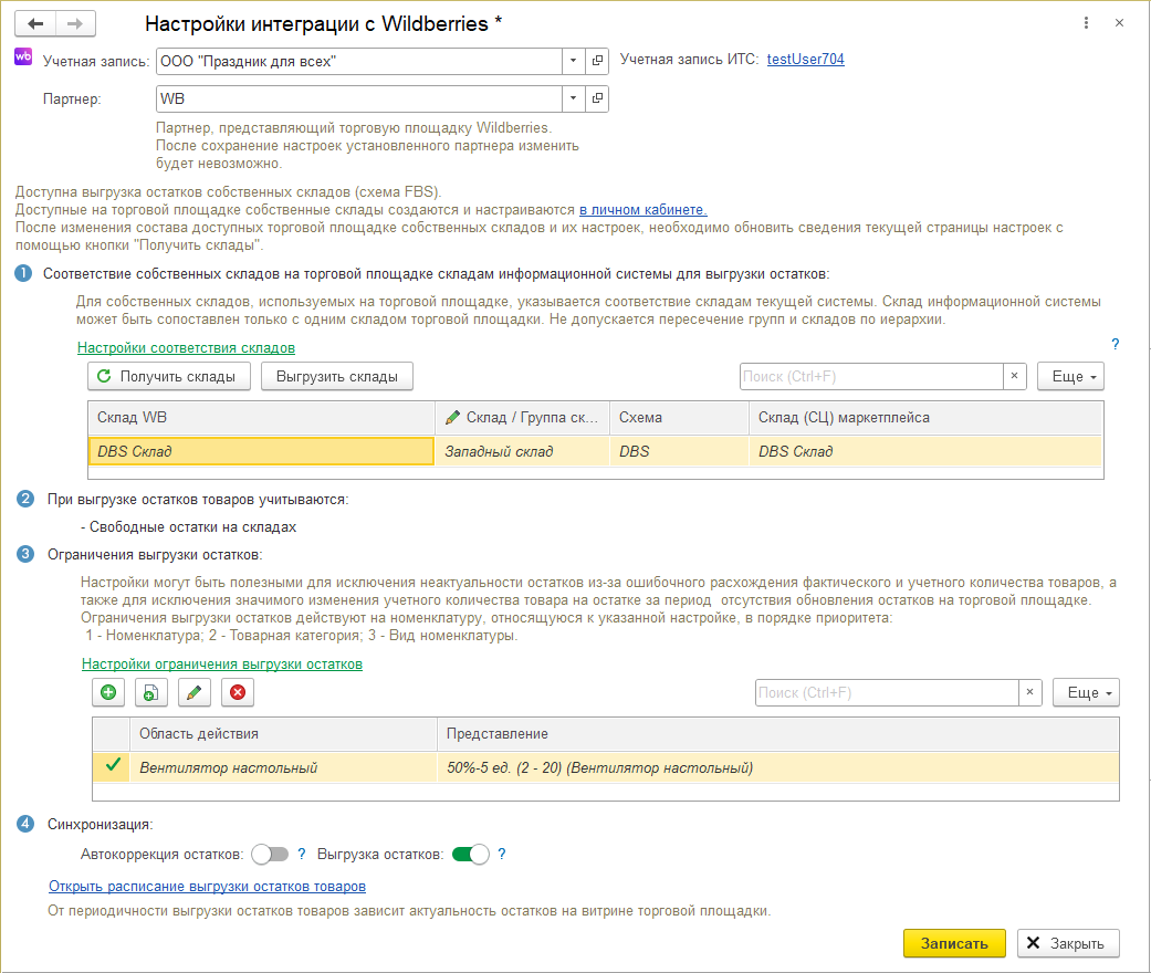 Перечень складов торговой площадки заранее задаются на сайте Wildberries и загружаются в информационную базу. В форме настроек в разделе Соответствие собственных складов на торговой площадке складам информационной системы для выгрузки остатков указывается соответствие загруженным складом торговой площадки складов информационной базы. Имеется возможность установить в соответствие складу торговой площадки группу складов 1С. Если установлена группа складов 1С, запрещено для другого склада торговой площадки указывать склады и группы из иерархии выбранной группы (контроль и вниз и вверх по иерархии).
