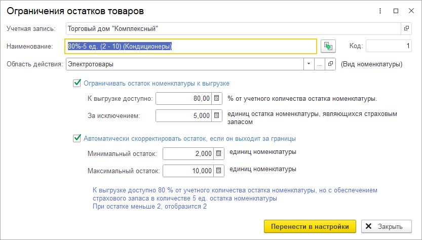 Для каждого ограничения задается область действия ограничения: номенклатура, товарная категория, вид номенклатуры. При наличии нескольких настроек с пересекающимися областями действия они применяются в порядке: