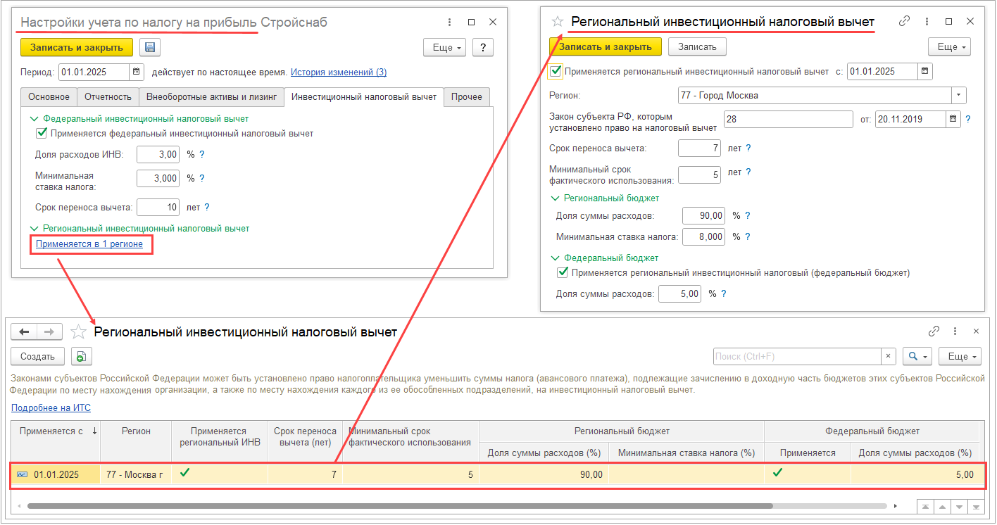 Параметры применения РИНВ определяются по гиперссылке в группе настроек Региональный инвестиционный налоговый вычет. Решение об использовании права на применение РИНВ налогоплательщиком, имеющим обособленные подразделения, принимается отдельно по каждому субъекту РФ, на территории которого расположены такие обособленные подразделения. РИНВ не применяется к объектам НМА.