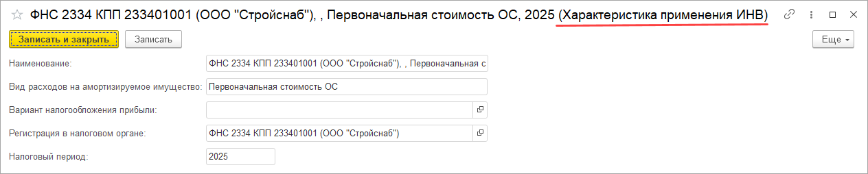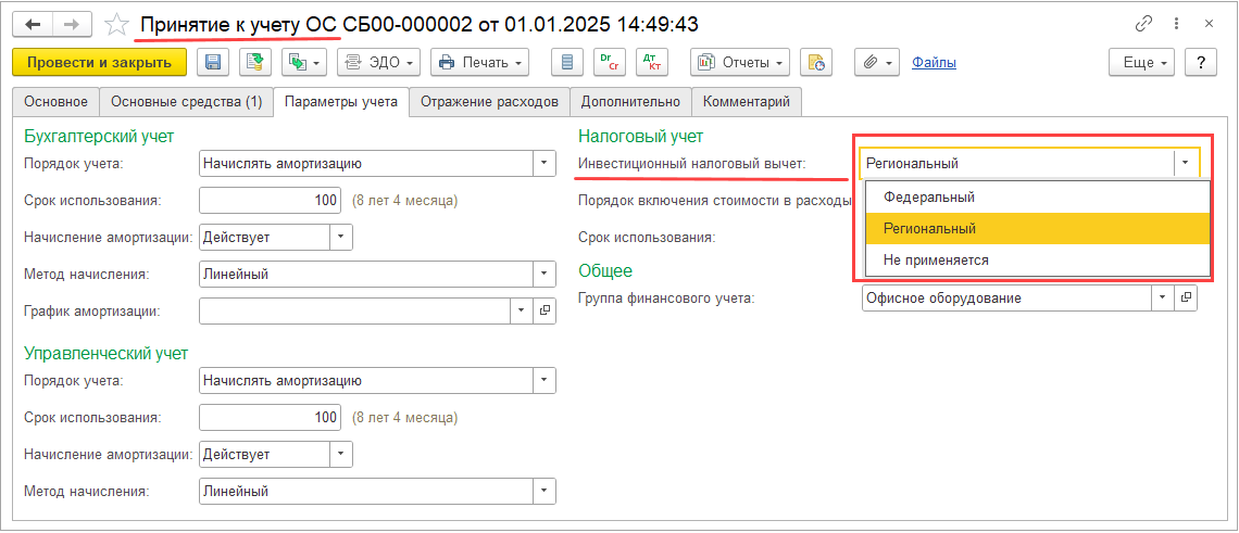 Решение об использовании права на применение инвестиционного вычета принимается в отношении конкретного объекта ОС/НМА. В документы Ввод остатков основных средств, Ввод остатков нематериальных активов и расходов на НИОКР, Принятие к учету ОС, Принятие к учету НМА, Модернизация ОС, Улучшение НМА добавлено поле Инвестиционный налоговый вычет, в котором для объекта необходимо указать применяется Федеральный или Региональный (для НМА доступен только вариант Федеральный) вычет или вычет Не применяется. При применении РИНВ по объекту ОС амортизация в налоговом учете не начисляется и амортизационная премия не применяется. Реквизит Порядок включения стоимости в расходы автоматически устанавливается в значение Стоимость не включается в расходы без возможности изменения. Реквизиты, относящиеся к настройке применения амортизационной премии, скрываются.