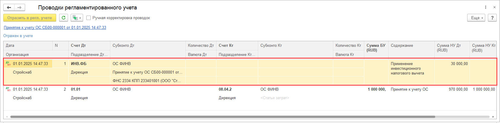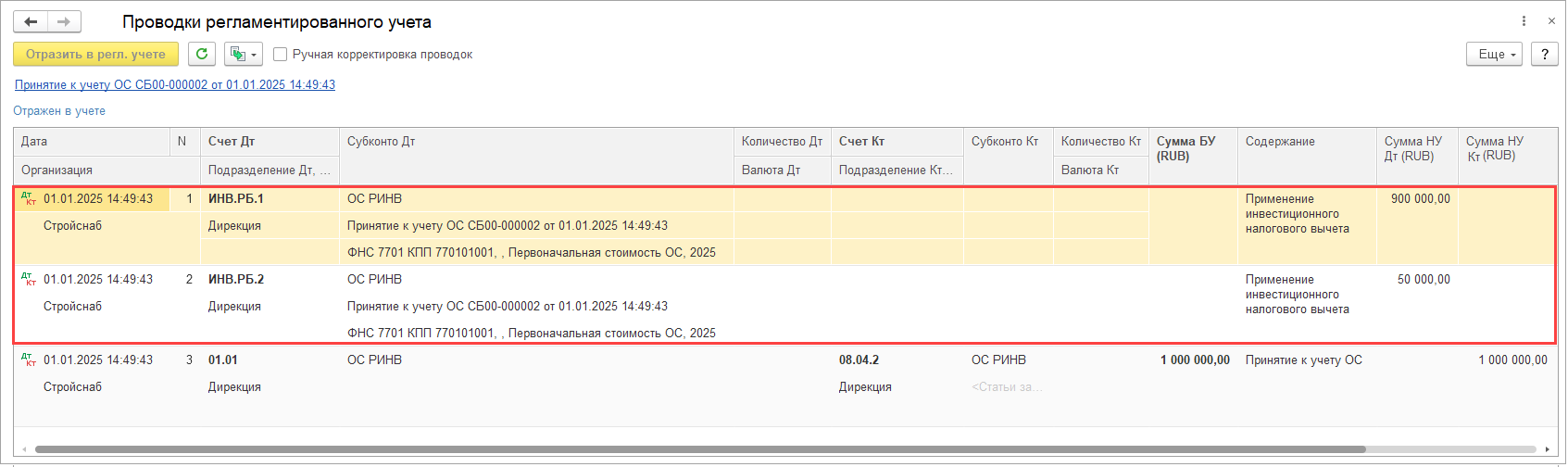 При выполнении регламентной операции Формирование финансового результата - Расчет налога на прибыль процедуры Закрытие месяца рассчитывается сумма уменьшения налога на ФИНВ и/или РИНВ. Вычет применяется по ФИФО по дате документа инвестиционного вычета (принятия к учету ОС/НМА, модернизации ОС, улучшения НМА и пр.)