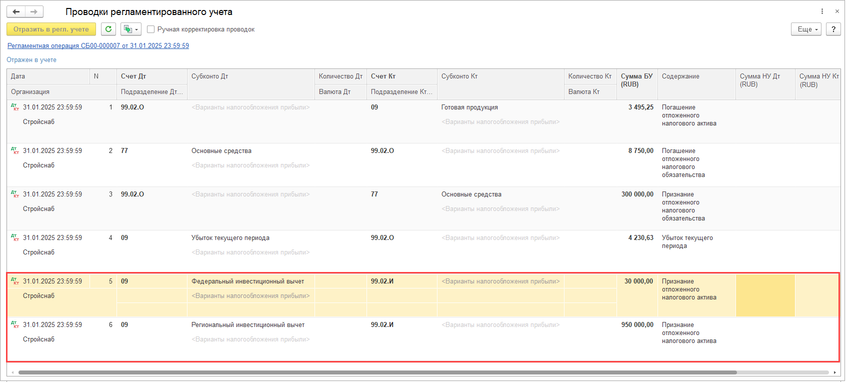 При выполнении регламентной операции Формирование финансового результата - Расчет отложенного налога по ПБУ 18 процедуры Закрытие месяца рассчитывается ОНА и формируются проводки Дт 09 (по новым видам активов/обязательств «Федеральный инвестиционный вычет» и «Региональный инвестиционный вычет») в корреспонденции с новым счетом 99.02.И «Инвестиционный вычет по налогу на прибыль» (счет имеет субконто «Варианты налогообложения прибыли», которое заполняется, если организация ведет раздельный учет по налогу на прибыль).