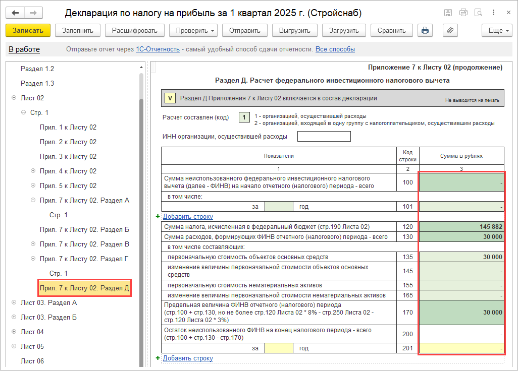 Разработана функциональность, позволяющая учитывать при расчете налога на прибыль применение организацией федерального и/или регионального инвестиционного вычета в соответствии со ст. 286.1, ст. 286.2 НК РФ и Постановлением Правительства РФ 1638 от 28.11.2024 «О параметрах применения федерального инвестиционного налогового вычета».