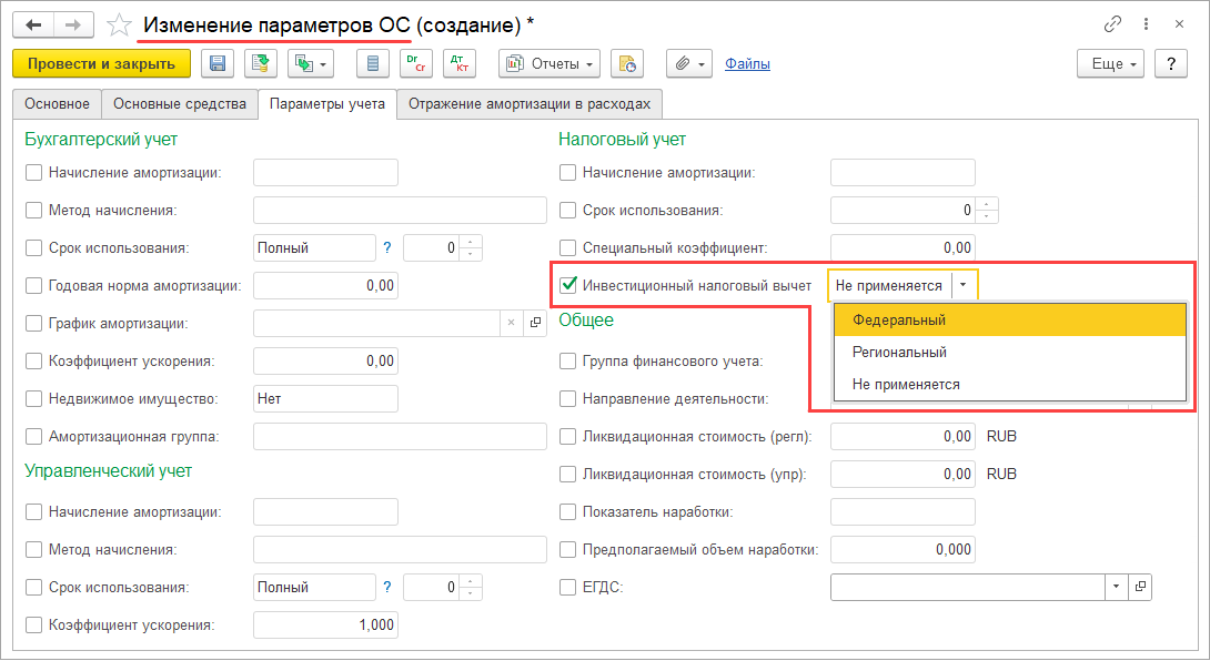 2. В конце 2025 года оформить документы Изменение параметров ОС, в которых указать по объектам ОС применение ФИНВ. Рекомендуется в одном документе указывать «однотипные» ОС, т.е. объекты, у которых одинаковая стоимость, амортизация, амортизационная премия. В документы Изменение параметров ОС добавлено поле Инвестиционный налоговый вычет для того, чтобы объекту ОС можно было определить применение федерального или регионального (далее - РИНВ) инвестиционного вычета. Возможность установки для ОС применения РИНВ в документе Изменение параметров ОС поддержана для последующего использования. Корректный пересчет налога на прибыль при установке РИНВ «задним числом» не поддерживается. В поле Параметры действуют с документа Изменение параметров ОС необходимо указать значение Даты документа.