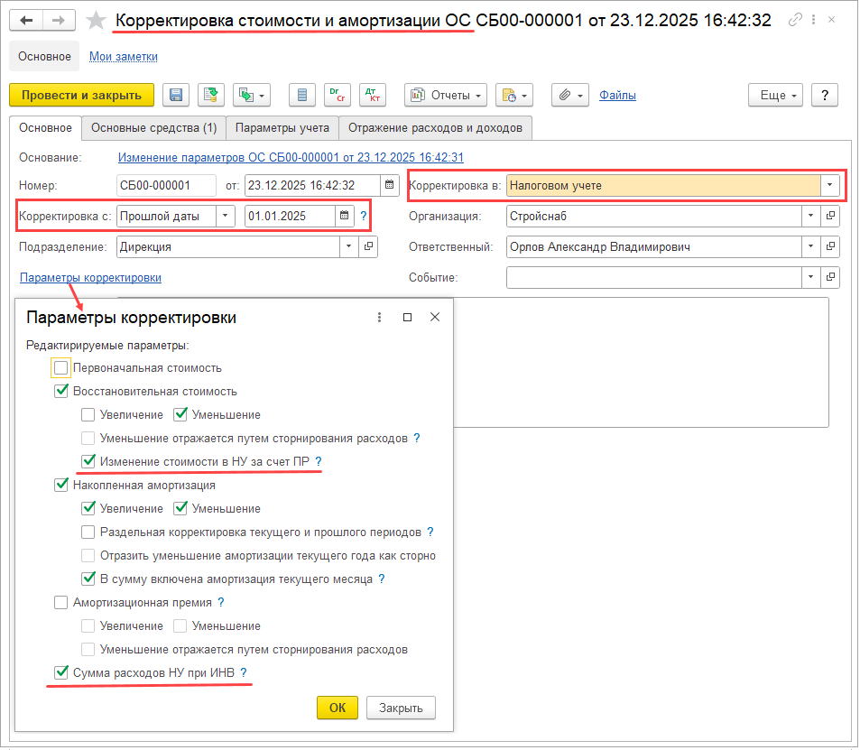 3. Для корректировки стоимости, амортизации и амортизационной премии на основании документов Изменение параметров ОС оформить документы Корректировка стоимости и амортизации ОС. Поддержано автоматическое заполнение документа Корректировка стоимости и амортизации ОС, введенного на основании документа Изменение параметров ОС, в котором определено применение инвестиционного налогового вычета для ОС, по которым ранее ИНВ не применялся. В документе Корректировка стоимости и амортизации ОС заполняются: