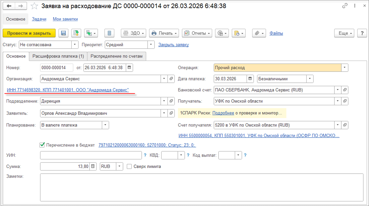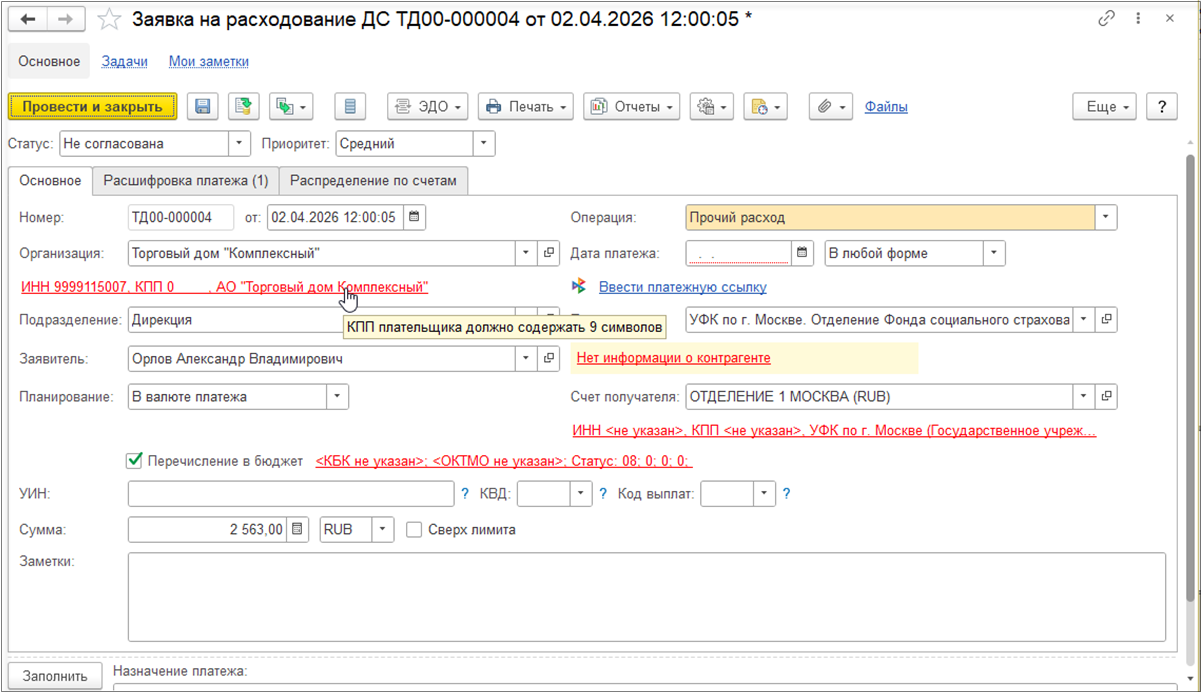 Особенности заполнения реквизитов плательщика в документах Заявка на расходование ДС
