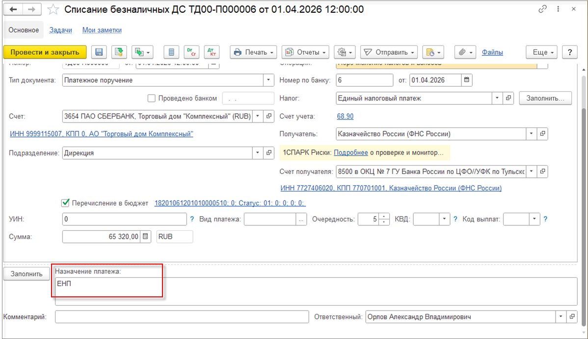 Аналогично для платежей в бюджет в документе Списание безналичных ДС наименование плательщика