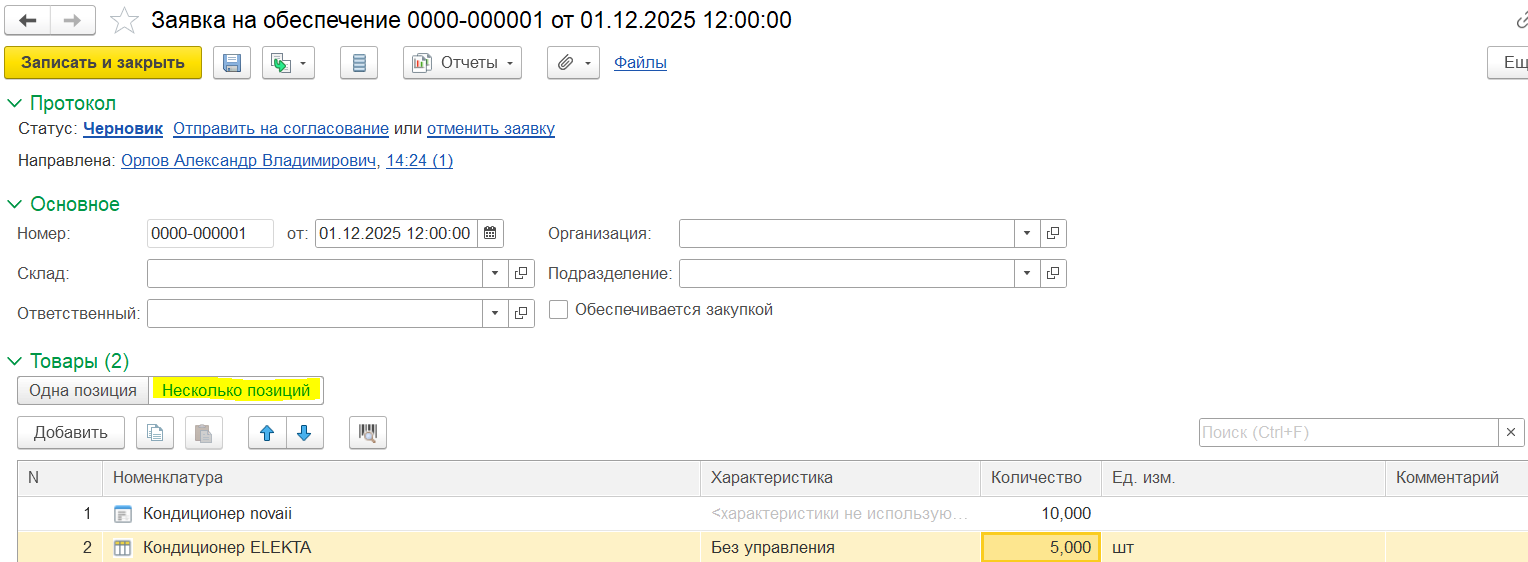 В статусе Черновик в заявке достаточно указать номенклатуру и количество.