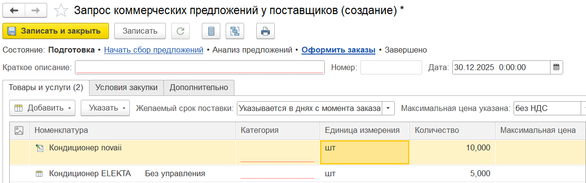 Сформировать запрос коммерческих предложений можно вводом на основании заявки на обеспечение документа Запрос коммерческих предложений у поставщиков. В запросе номенклатура, валюта, организация, склад наследуются из документа заявки на обеспечение, цены и сроки заполняются исполнителем вручную.