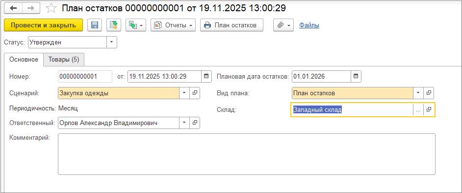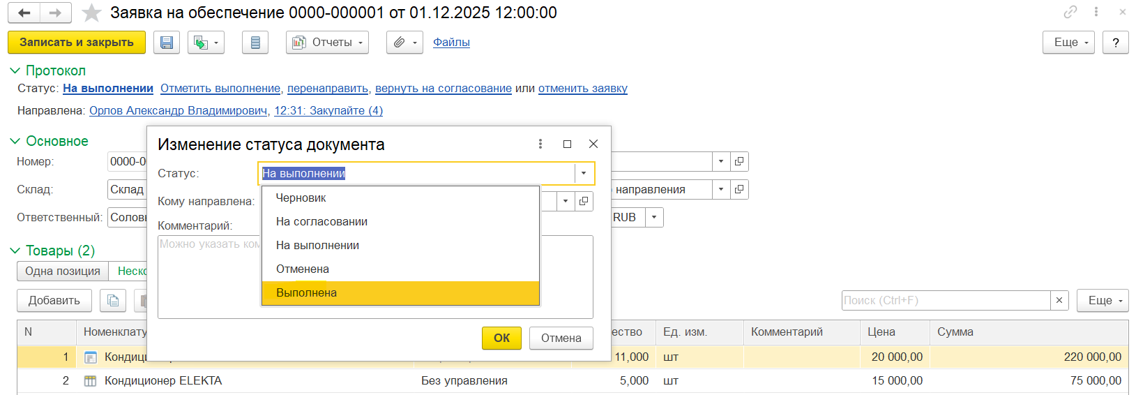 В заявке в статусе «На выполнении» заполнение реквизитов Склад, Организация, Подразделение, Ответственный является обязательным.