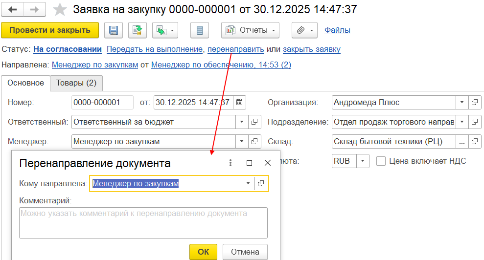 Если менеджер по закупкам уже известен, то необходимо выбрать его в поле «Менеджер», которому можно перенаправить заявку по гиперссылке «перенаправить».