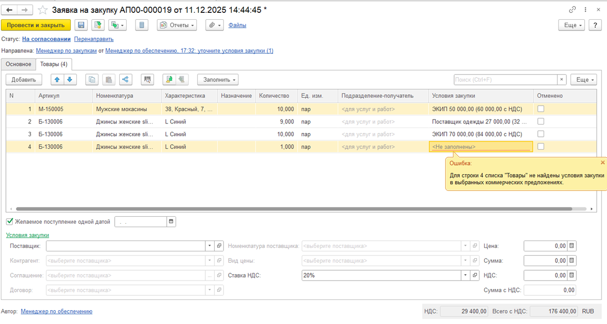 При повторной попытке для четвертой строки заполнить цену (условия закупки) по коммерческому предложению также будет выведено сообщение о том, что «не найдены условия закупки в выбранных коммерческих предложениях».