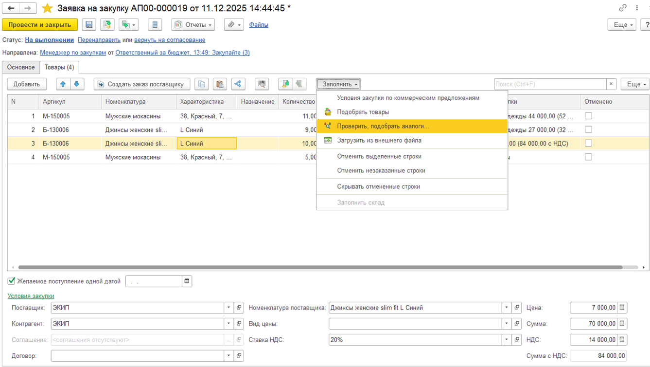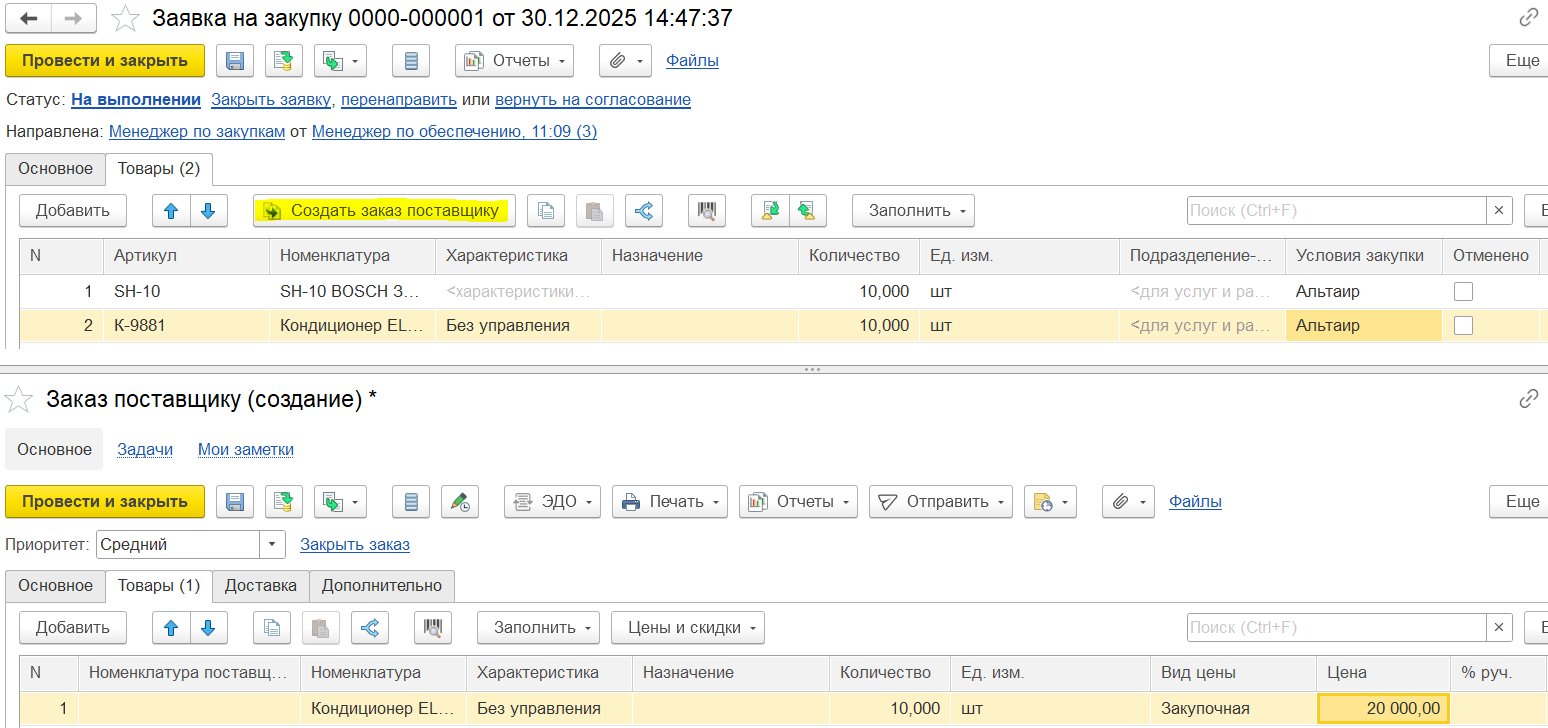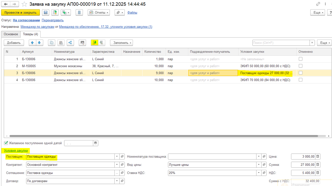 Заявитель не знает, у какого партнера и по каким ценам выполняется закупка, поэтому на первом этапе работы с документом не подразумевается работа с условиями закупки. Например, при подборе товаров не предусмотрена информация о цене, только о количестве.