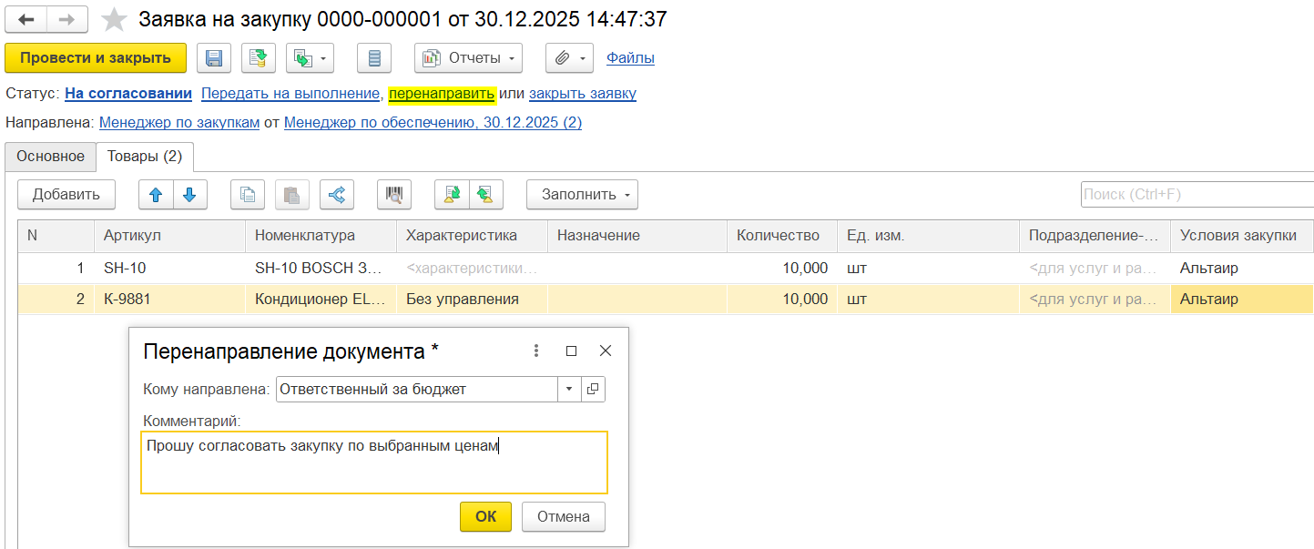После заполнения условий закупки заявка перенаправляется по гиперссылке «перенаправить» пользователю с ролью «Согласование заявок на закупку», чтобы согласовать и передать на выполнение заявку на закупку.
