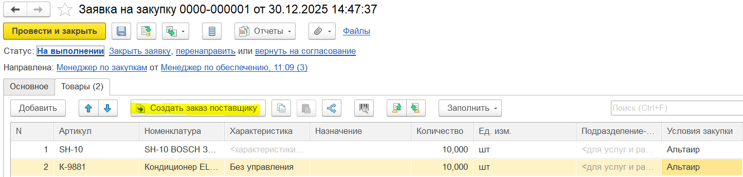 Заявка в статусе «На выполнении» может обеспечиваться различными типами документов (например, заказ на внутреннее потребление, заказ поставщику).