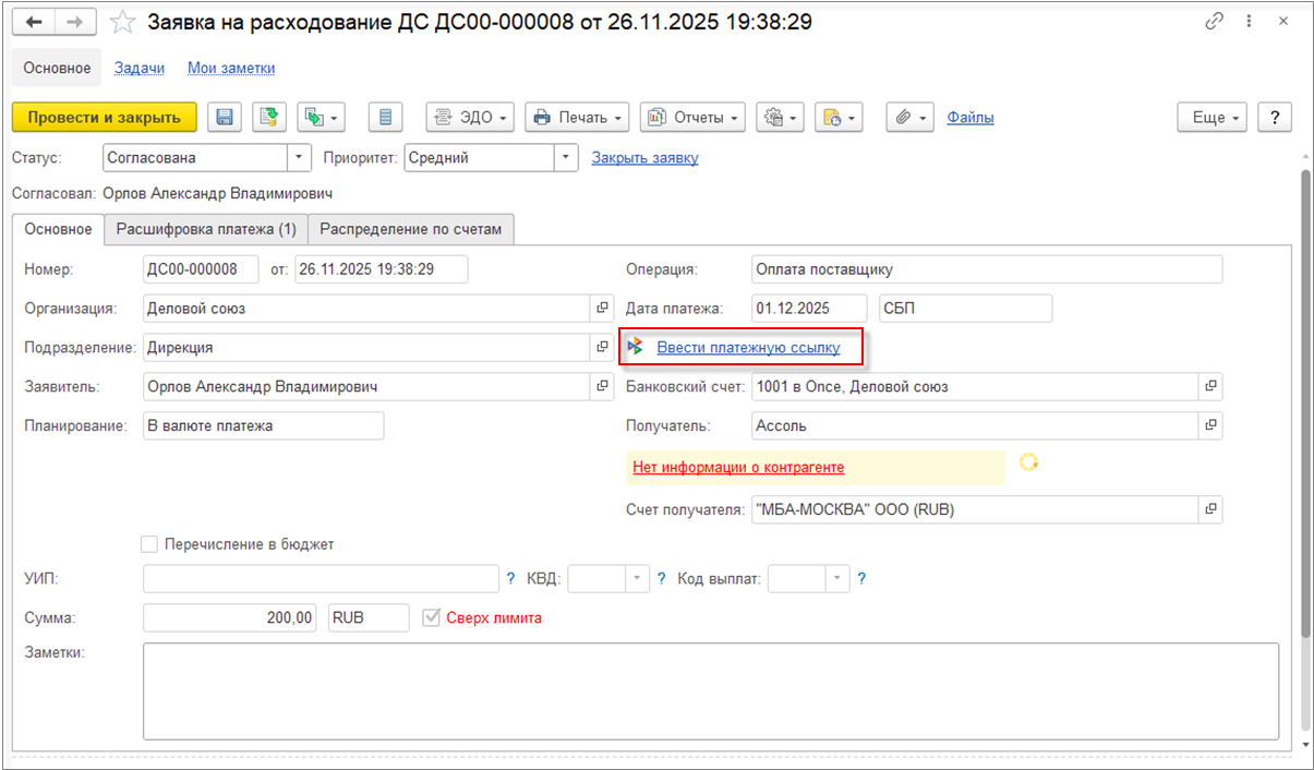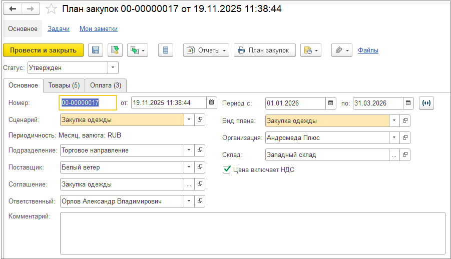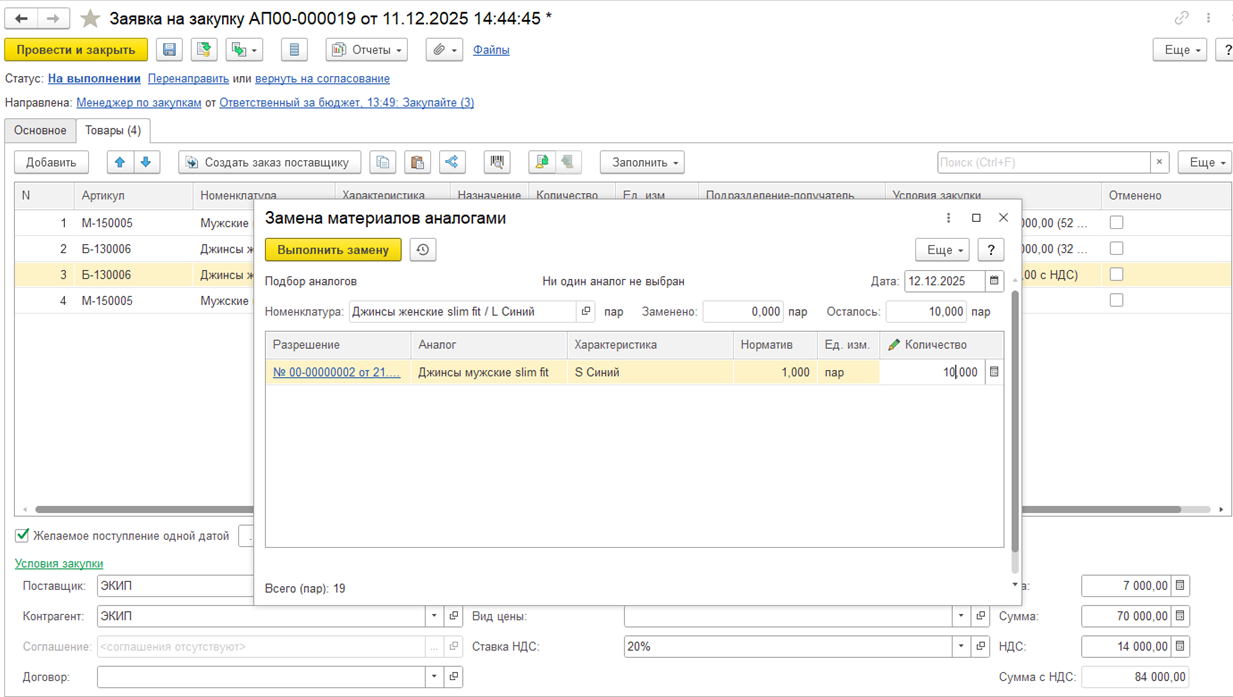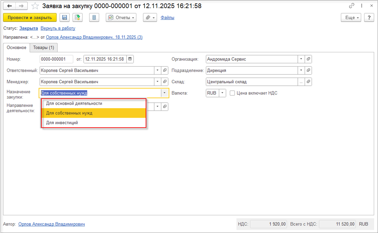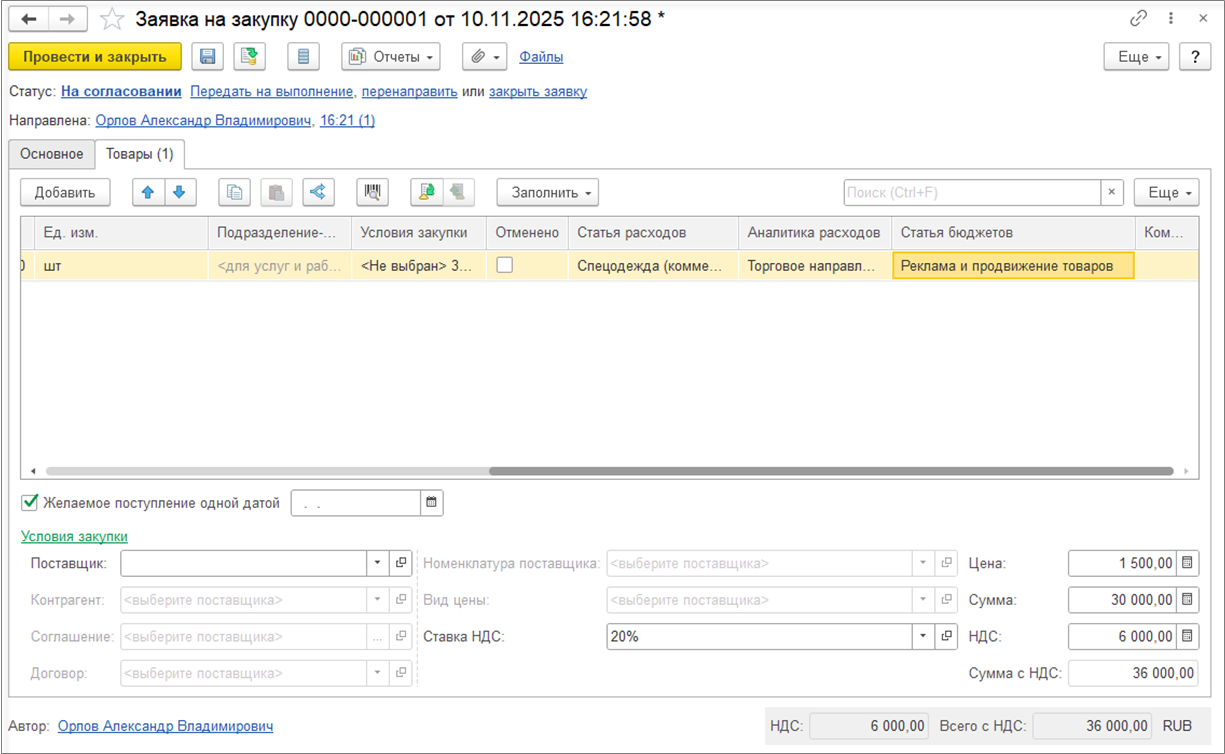 Когда ввод потребности завершен, можно передать заявку на согласование по гиперссылке Отправить на согласование. По умолчанию заявка при передаче на согласование перенаправляется ответственному, который указан в заявке.