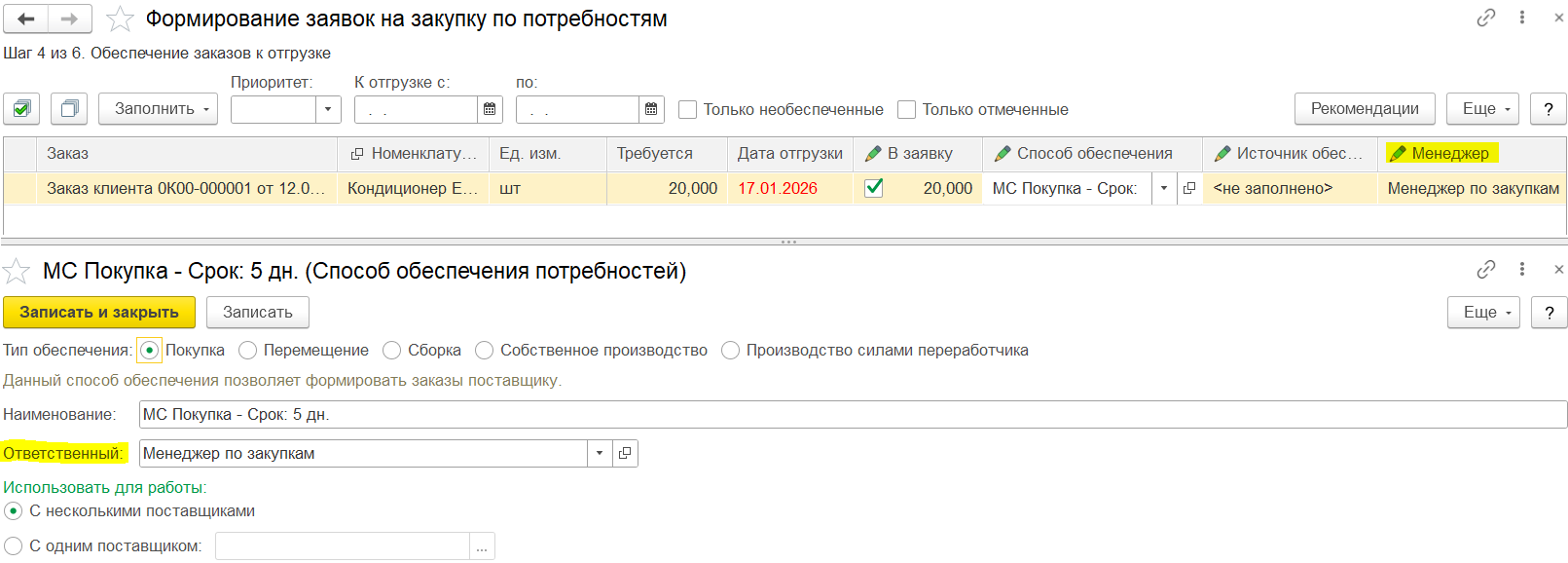 Пользователи формируют потребности. Например, менеджеры по продажам могут сформировать заказы клиентов, менеджер по обеспечению формирует обеспечивающие потребности документы с помощью рабочего места Формирование заявок на закупку по потребностям – заявки на закупку, которые назначаются менеджеру по закупкам. Менеджер по закупкам (исполнитель) может быть указан в способе обеспечения потребностей, из которого наследуется в документы заявок на закупку, сформированные с использованием рабочего места Формирование заявок на закупку по потребностям.