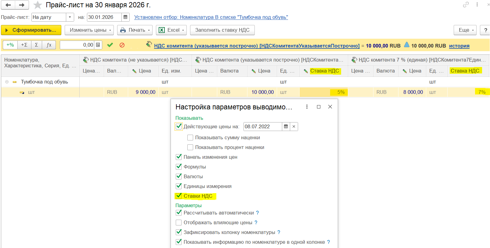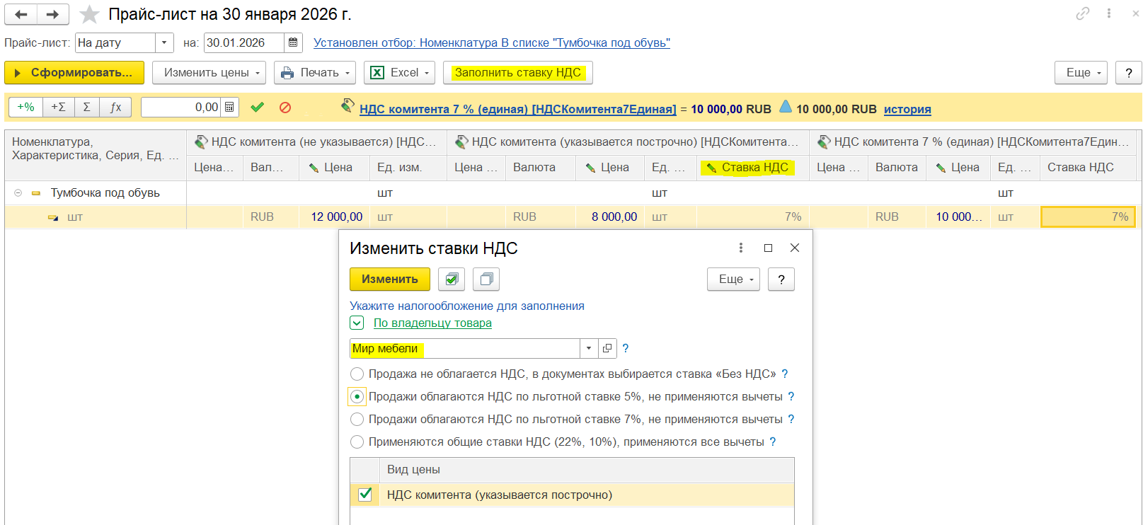 Цены можно заполнить по видам цен предприятия (команда Заполнить – Цены по виду цены) или поставщиков (команда Заполнить – Цены по виду цен поставщика) только для позиций, выбранных из справочника «Номенклатура».