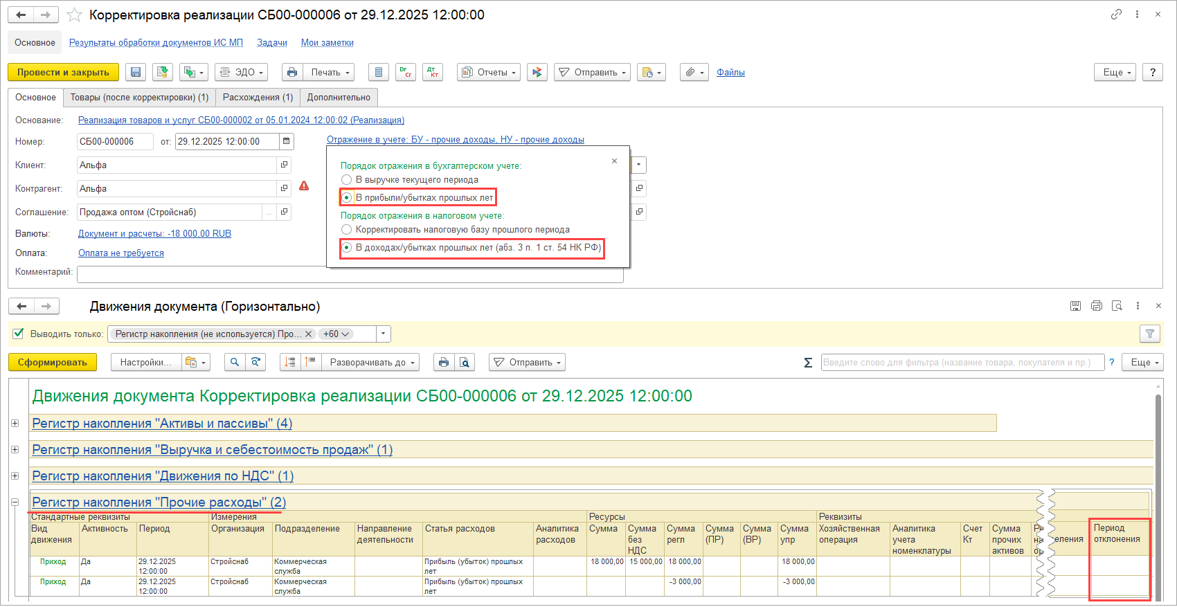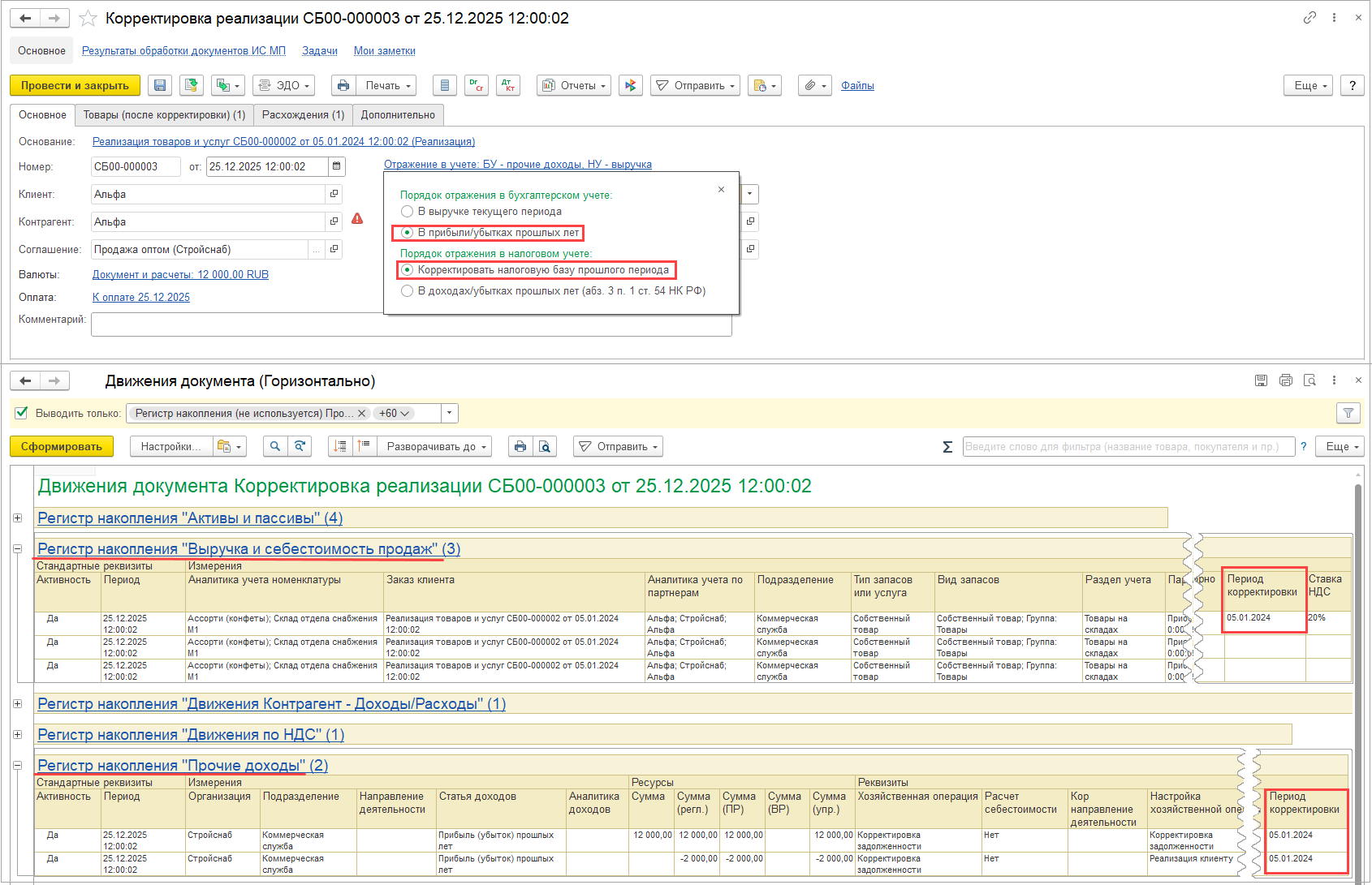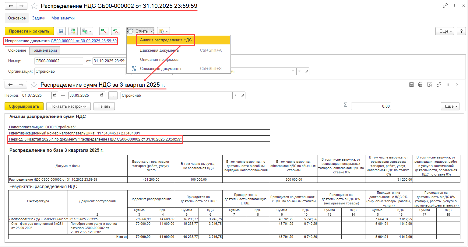 При изменении данных к распределению в результате оформления корректировки приобретения или исправления первичных документов прошлого периода изменение распределения НДС учитывается в периоде исправления (отражается в документе Распределение НДС за период, к которому относится исправление), но распределение выполняется по базе периода исправляемого документа.