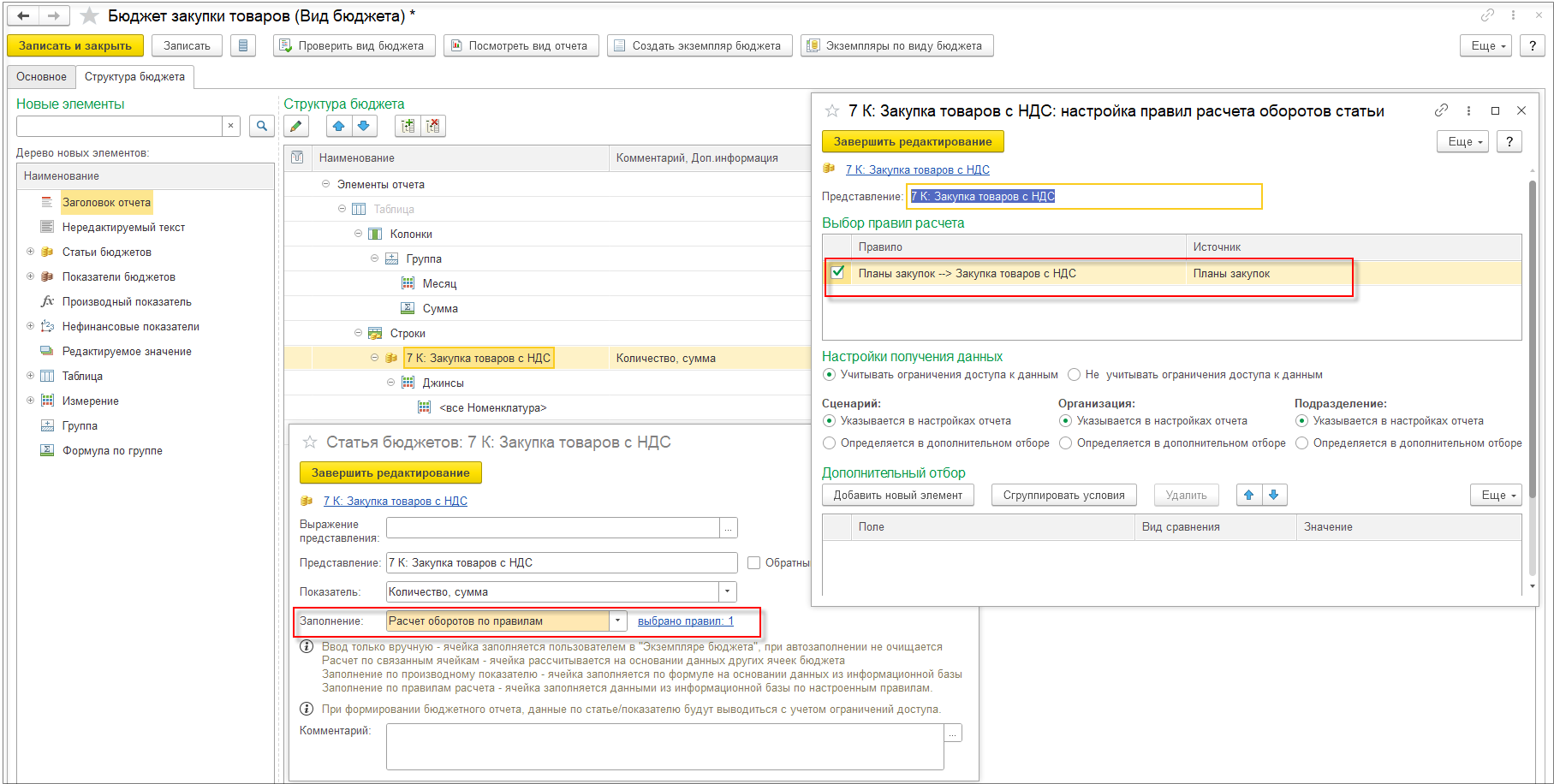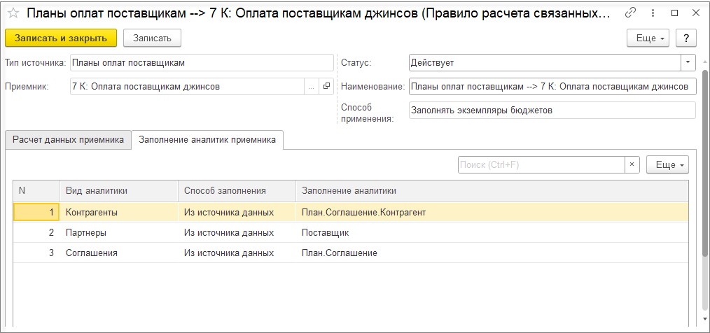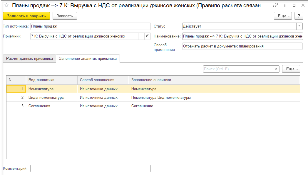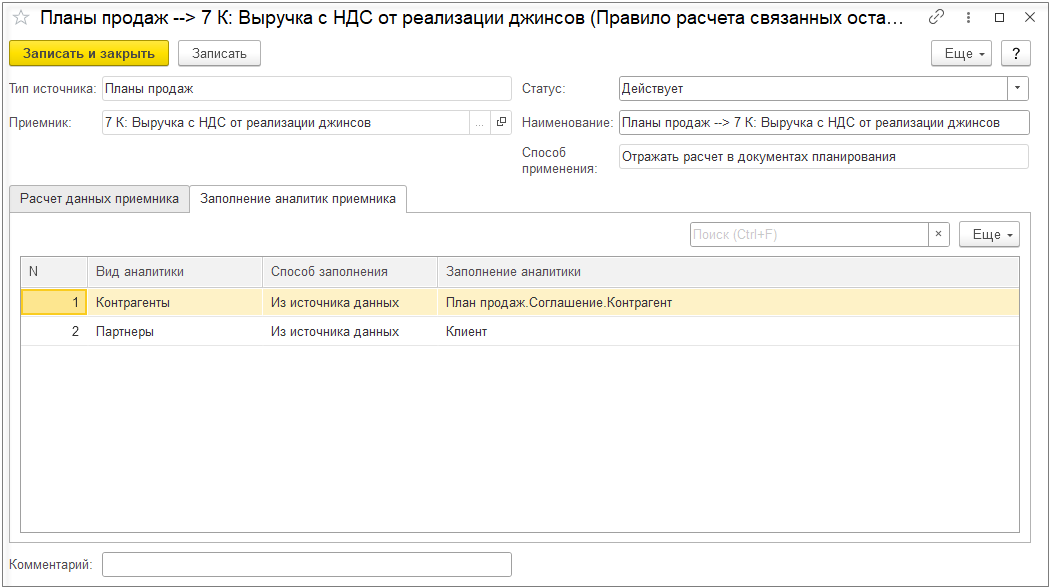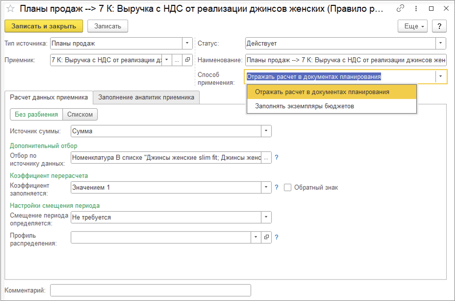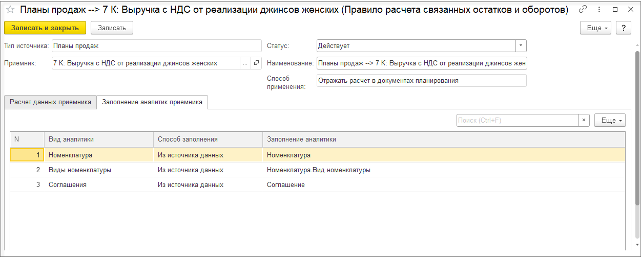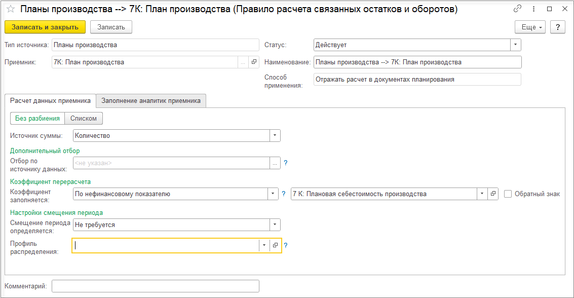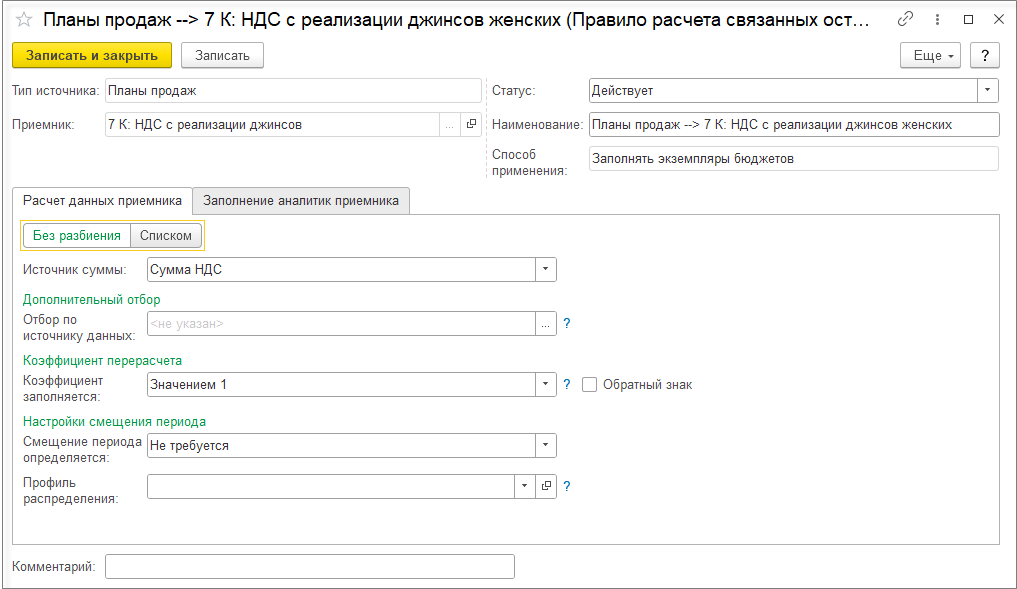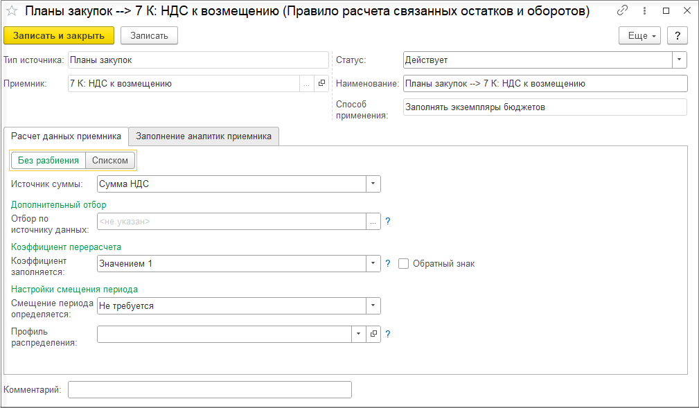 При выключенной настройке Детализировать себестоимость продукции до исходных затрат детализация себестоимости рассчитывается только по партиям покупной номенклатуры и не рассчитывается по партиям выпускаемой продукции. При этом отключение детализации себестоимости продукции до исходных затрат позволяет существенно уменьшить объем данных детализации партий и ускорить выполнение этапа подготовки данных для детализации партий. Поэтому отключение детализации себестоимости продукции имеет смысл, если нет ситуаций, когда для выпущенной продукции меняется вид деятельности НДС, но материалы могут использоваться на выпуск продукции по разным видам деятельности НДС.
