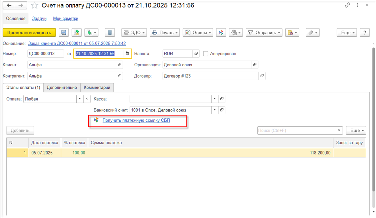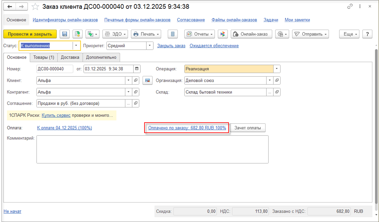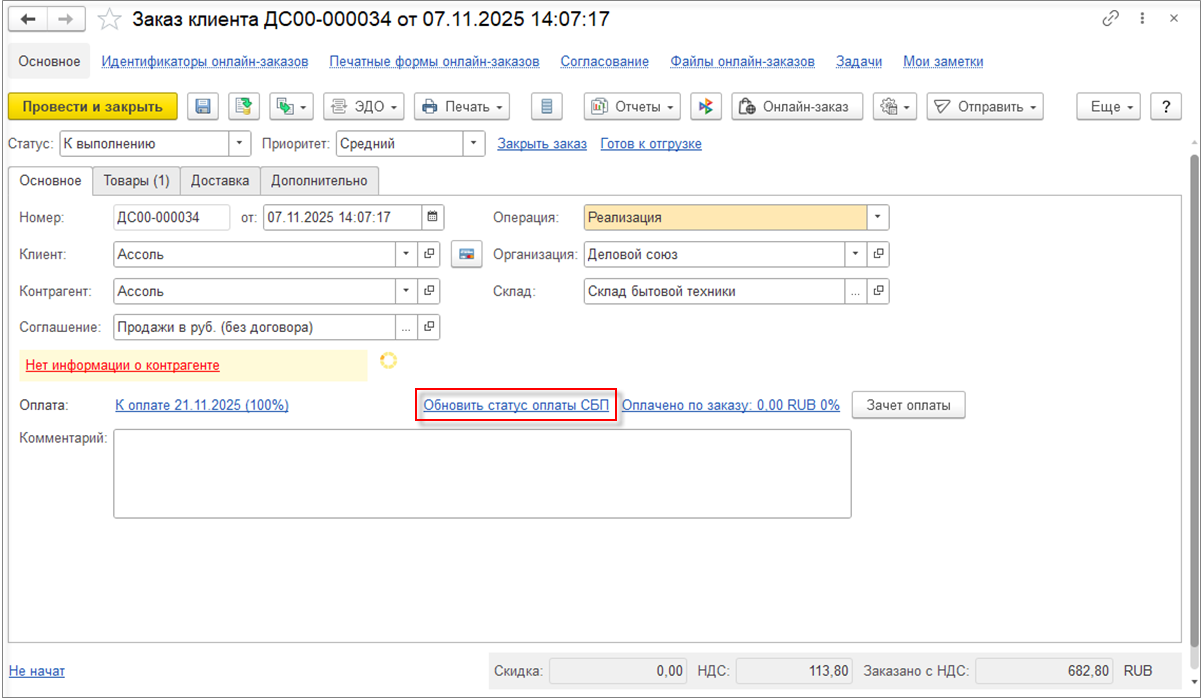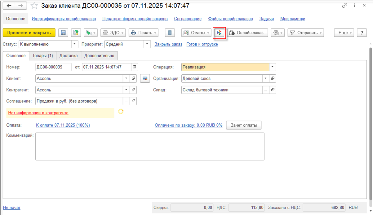 Создание и отправка ссылки на сформированный онлайн-заказ доступно в документе Заказ клиента с помощью кнопки Онлайн-заказ.