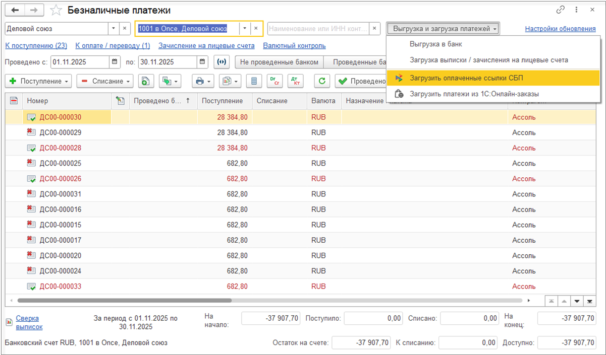 В рабочем месте Безналичные платежи с помощью кнопки Загрузить платежи из 1С: Онлайн-заказы осуществляется загрузка документов оплаты по онлайн-заказам.