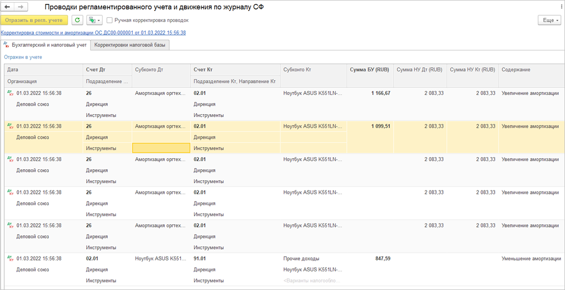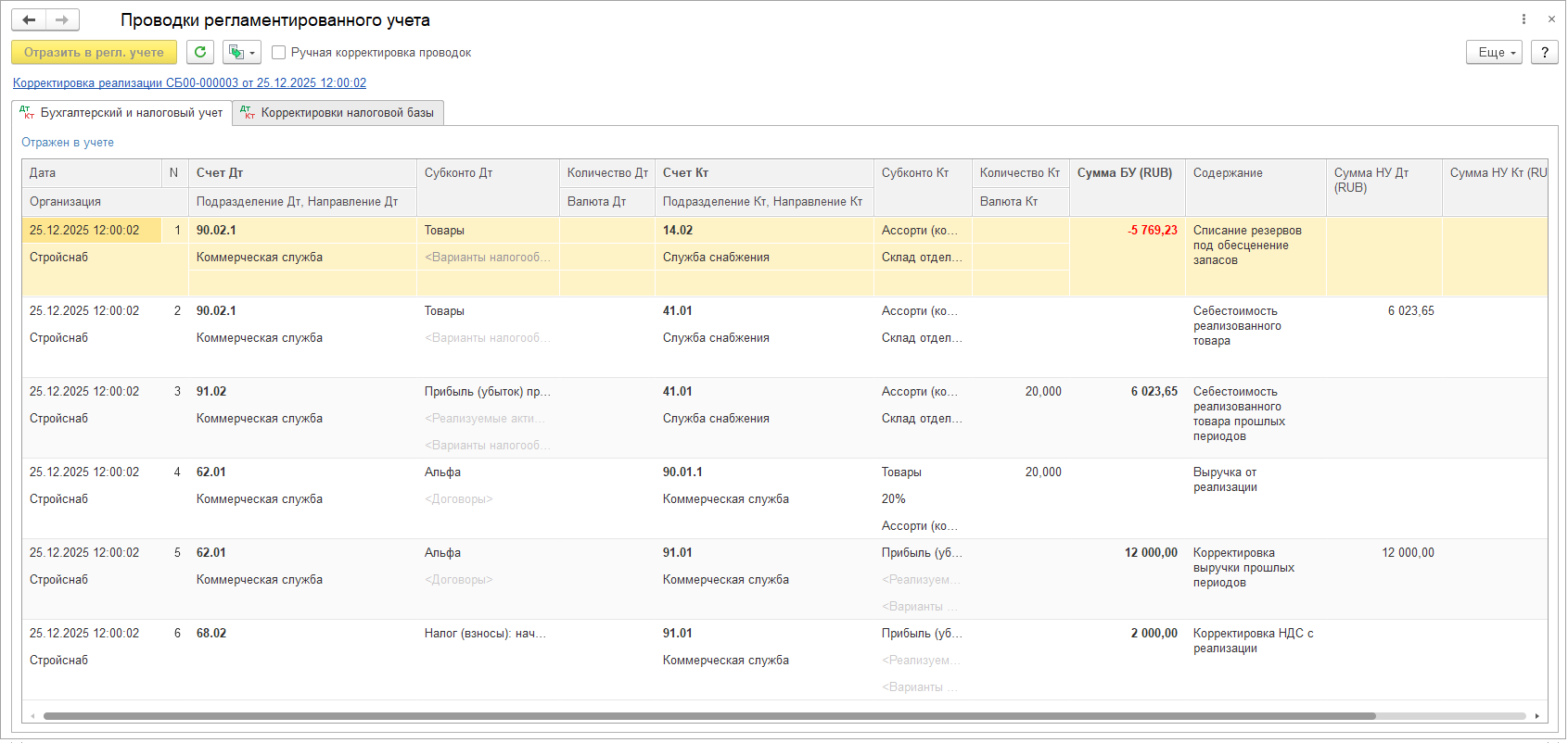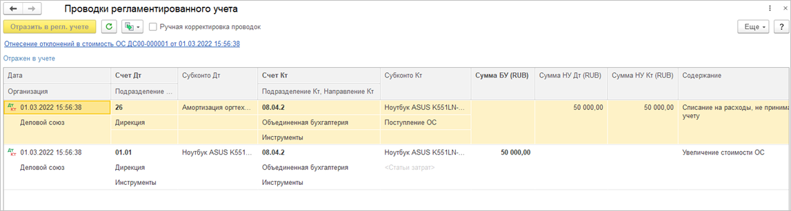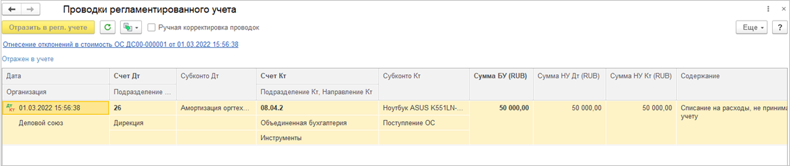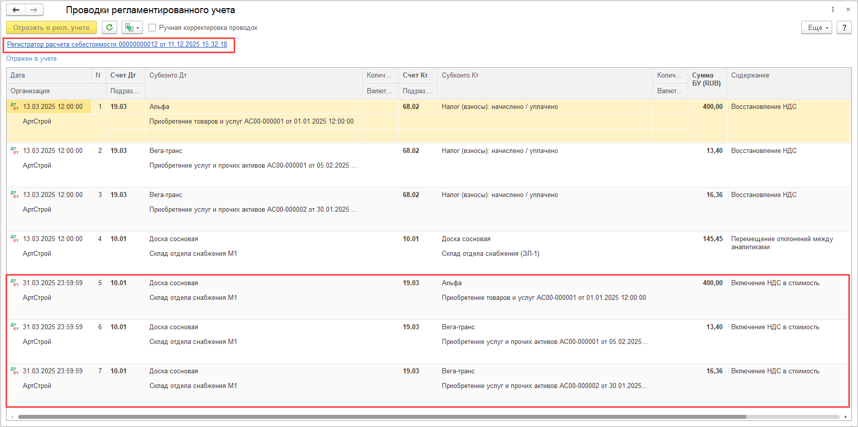 При отражении документов Регистратор расчета себестоимости в регламентированном учете на суммы включения/исключения НДС в/из стоимости товаров формируются проводки по Дт счета Отклонения из ГФУ номенклатуры.
